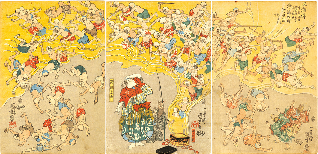 国芳は豊国の門人で、当初は兄弟子の国貞等の人気に勝てず、しばらくは不遇であった。文政頃に発表した「通俗水滸伝豪傑百八人」の連作が評判となり、「武者絵の国芳」と称され、人気絵師の仲間入りを果たした。その後は画想の豊かさ、斬新なデザイン力、奇想天外なアイデア、確実なデッサン力を持ち、浮世絵の枠にとどまらない広範な魅力を持つ作品を多数生み出した。