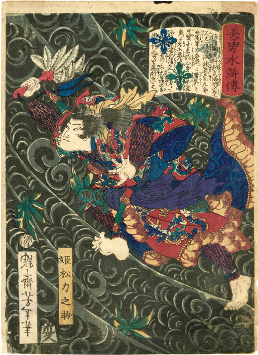 「美勇水滸伝」は慶応二年から三年にかけて出版された目録共51枚からなる中判の連作である。師である国芳の「通俗水滸伝」シリーズを踏まえた作品であるが、題材は中国の「水滸伝」ではなく当時流行の読本などに登場する日本の人物にとっている。