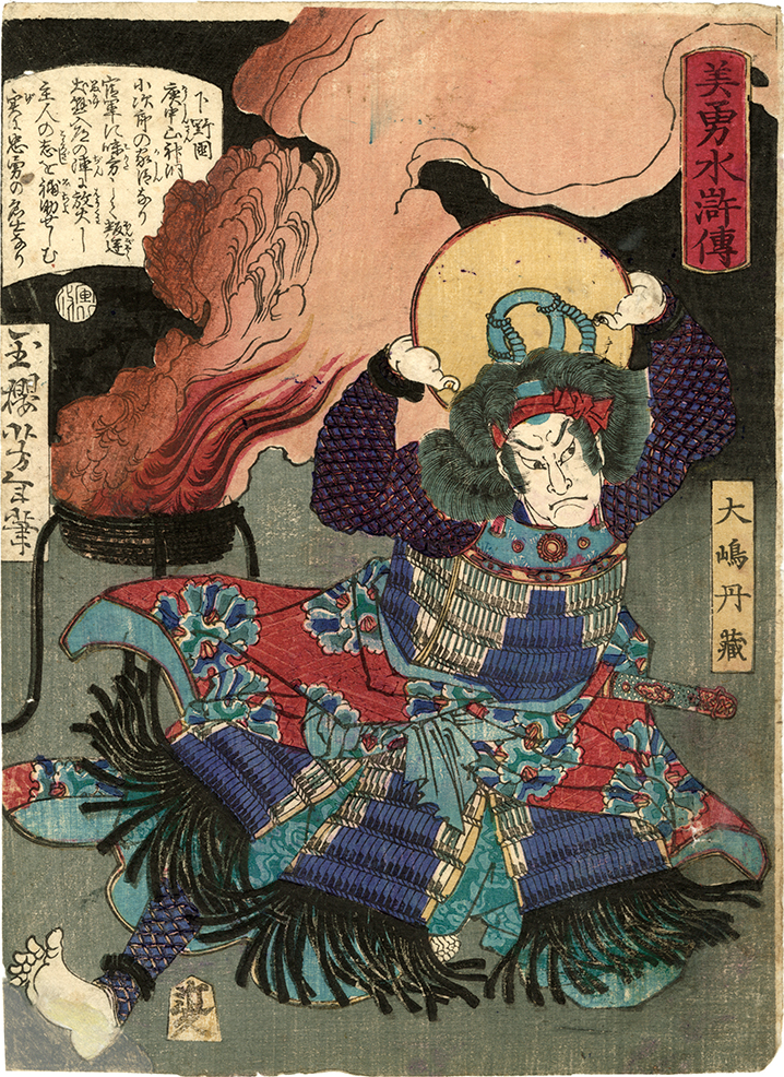 「美勇水滸伝」は慶応二年から三年にかけて出版された目録共51枚からなる中判の連作である。師である国芳の「通俗水滸伝」シリーズを踏まえた作品であるが、題材は中国の「水滸伝」ではなく当時流行の読本などに登場する日本の人物にとっている。