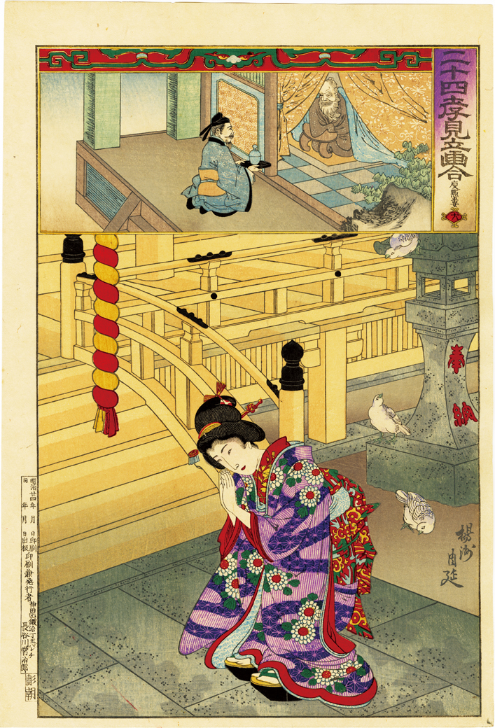 周延は国芳に絵を学んで芳鶴二代を名乗るが、国芳の死後は豊国三代につき、さらに豊国三代が亡くなると国周に転じて周延と号した。