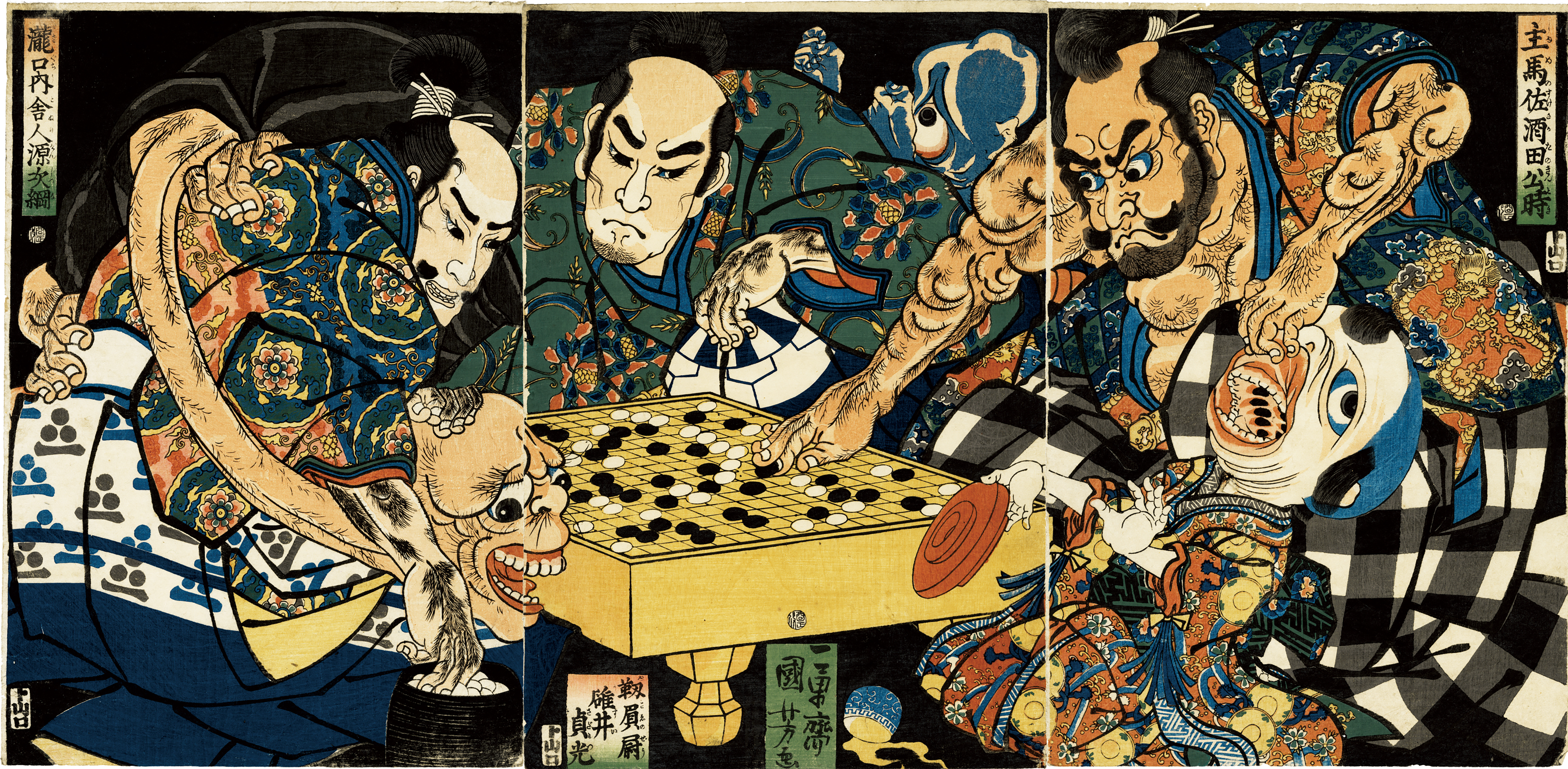 国芳は豊国の門人で、当初は兄弟子の国貞等の人気に勝てず、しばらくは不遇であった。文政頃に発表した「通俗水滸伝豪傑百八人」の連作が評判となり、「武者絵の国芳」と称され、人気絵師の仲間入りを果たした。その後は画想の豊かさ、斬新なデザイン力、奇想天外なアイデア、確実なデッサン力を持ち、浮世絵の枠にとどまらない広範な魅力を持つ作品を多数生み出した。