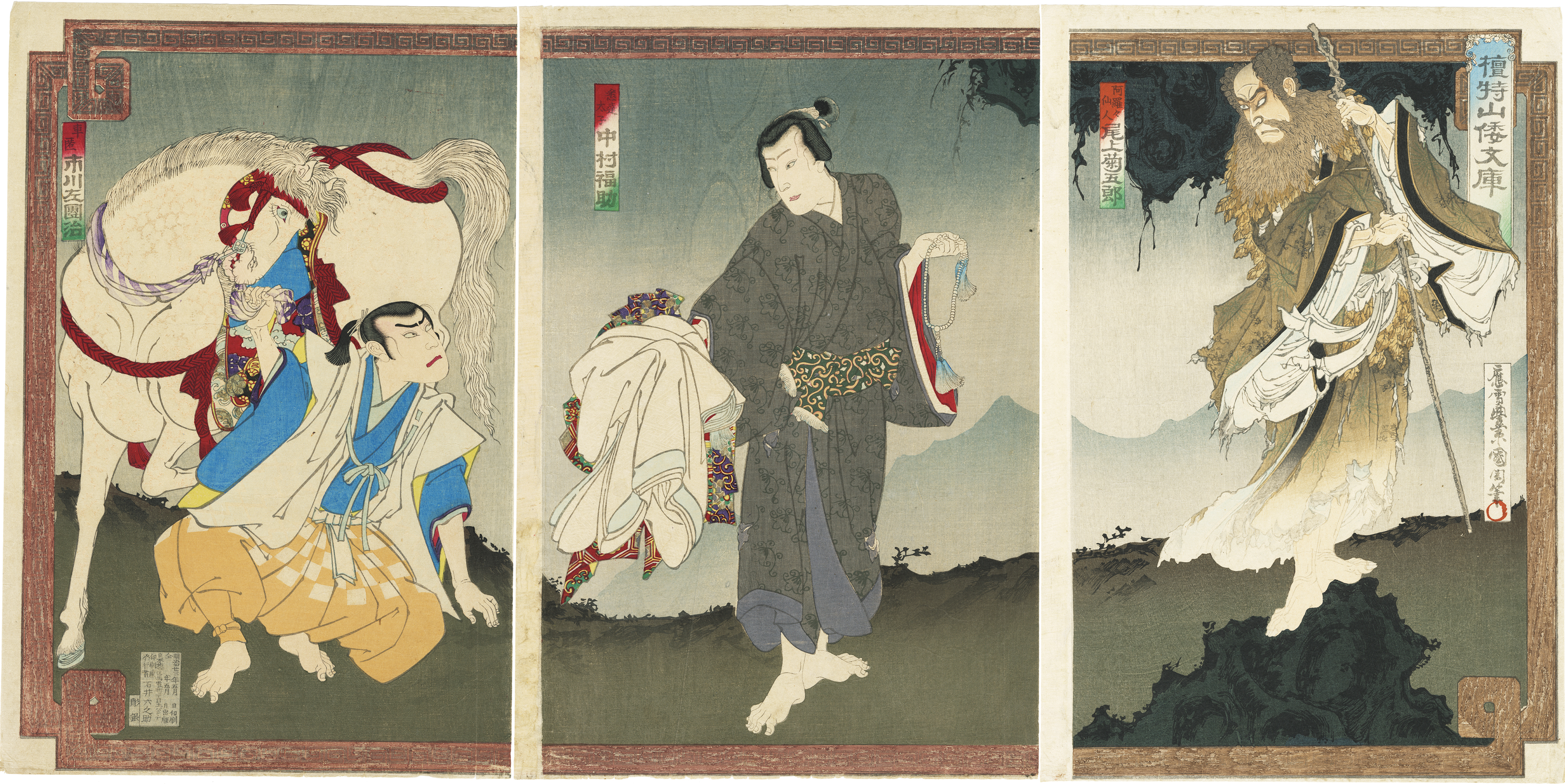 国周は周信及び豊国三代の門人で、小島烏水によって「明治の写楽」と称せられる。3枚続に役者一人を描くという新しい構成は国周が創始したとされる。明治期における役者絵浮世絵師の代表的存在であり、作品数も多く、明治演劇史の資料としても大変価値がある。