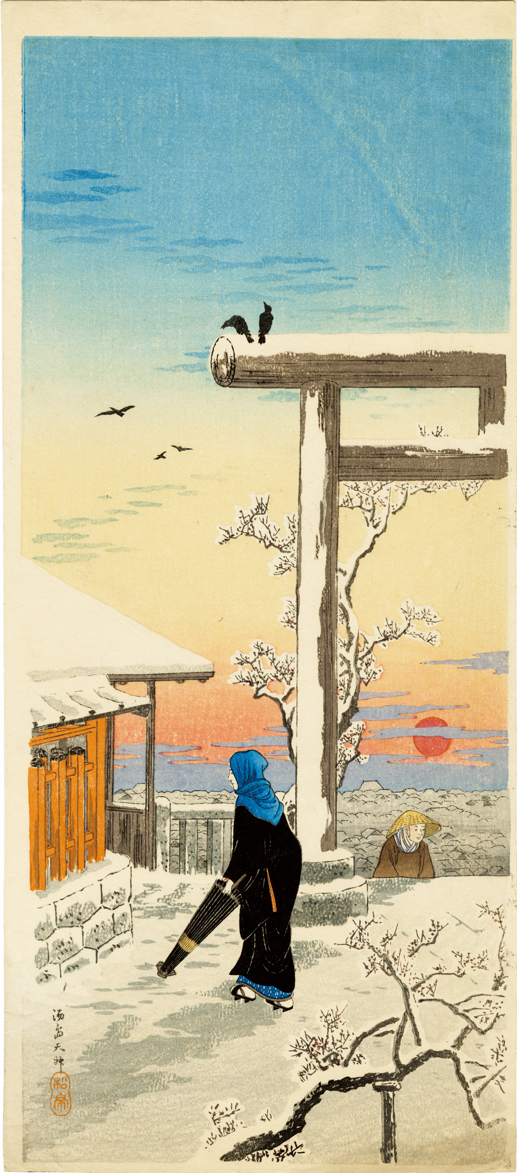 渡辺庄三郎は独立開業すると、松亭に作画を依頼して「新作版画」を制作した。松亭の新作版画は海外で人気を獲得して、継続してよく売れたようである。これらが基盤となり新版画が制作されるに至った。