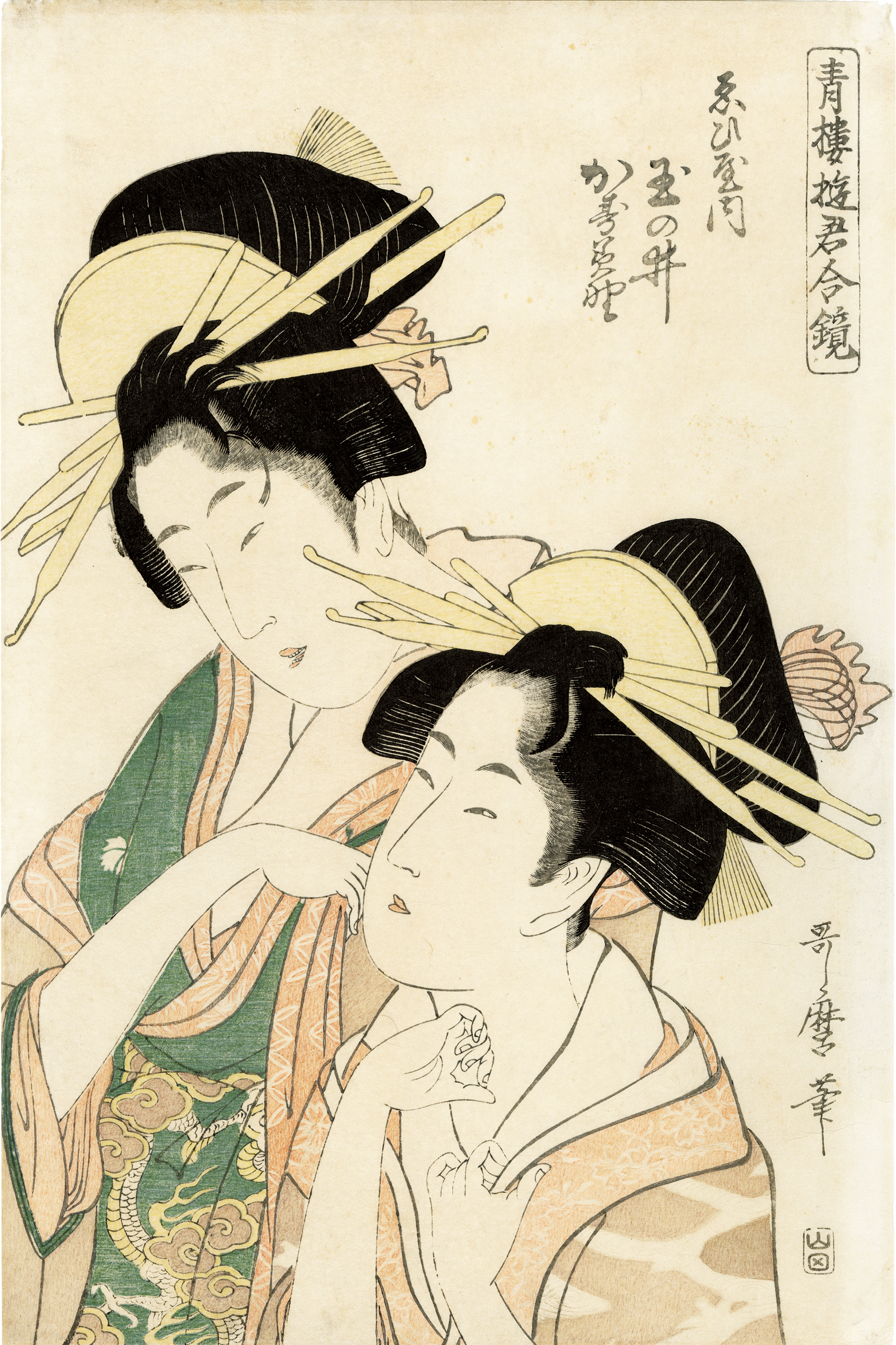 初め、狩野派の町絵師・鳥山石燕に学び、版元・蔦屋重三郎に見出されて後、評判の町娘や遊里の女性たちを魅力的に描き、浮世絵美人画の第一人者としてその名を知らしめた。