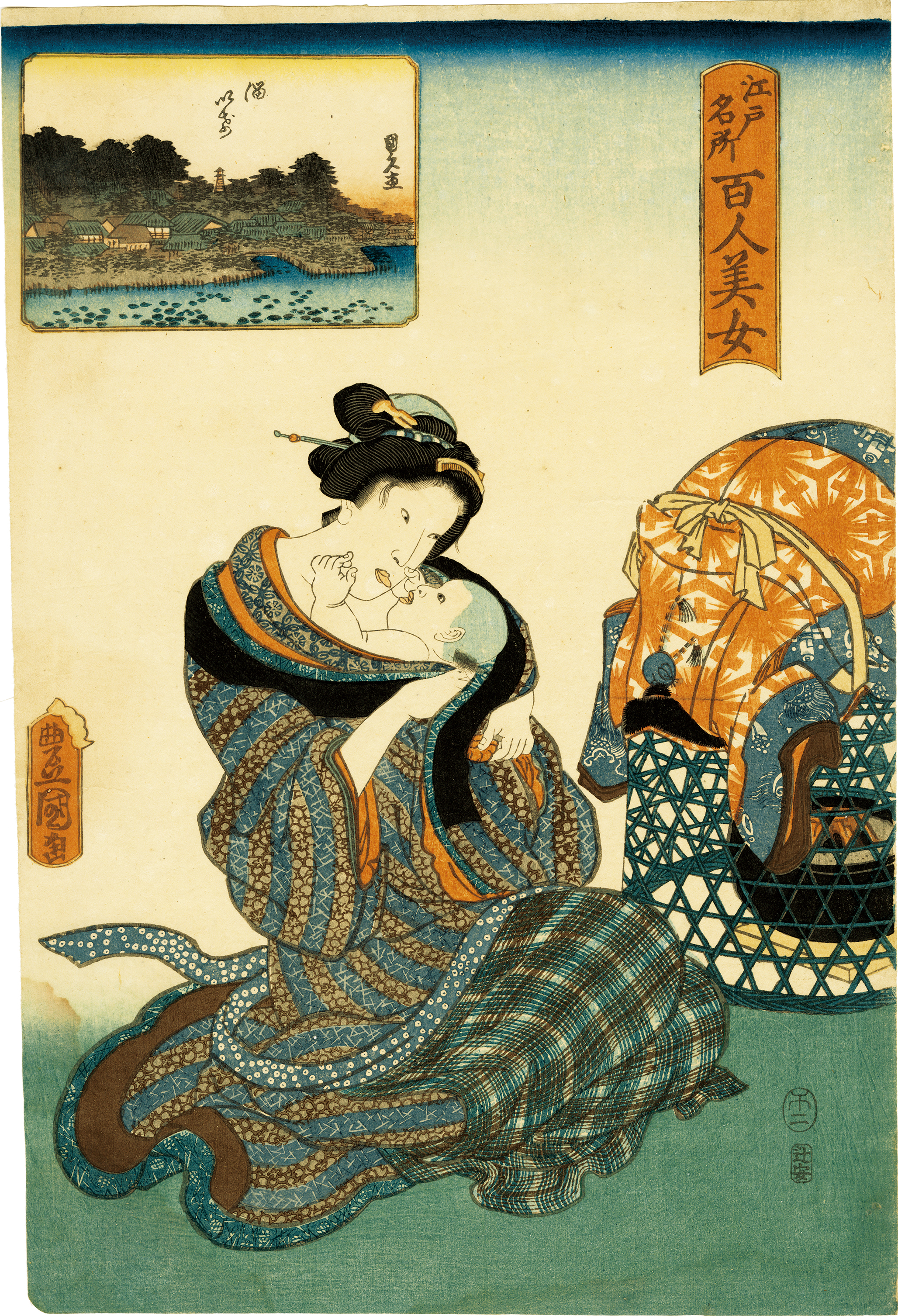 A mother shows her tongue to her child and the child imitates her. A child's kimono, embroidered with "back protection" to ward off evil spirits, is put on a cock cage covered by a brazier beside them. It is presumably being warmed or dried.