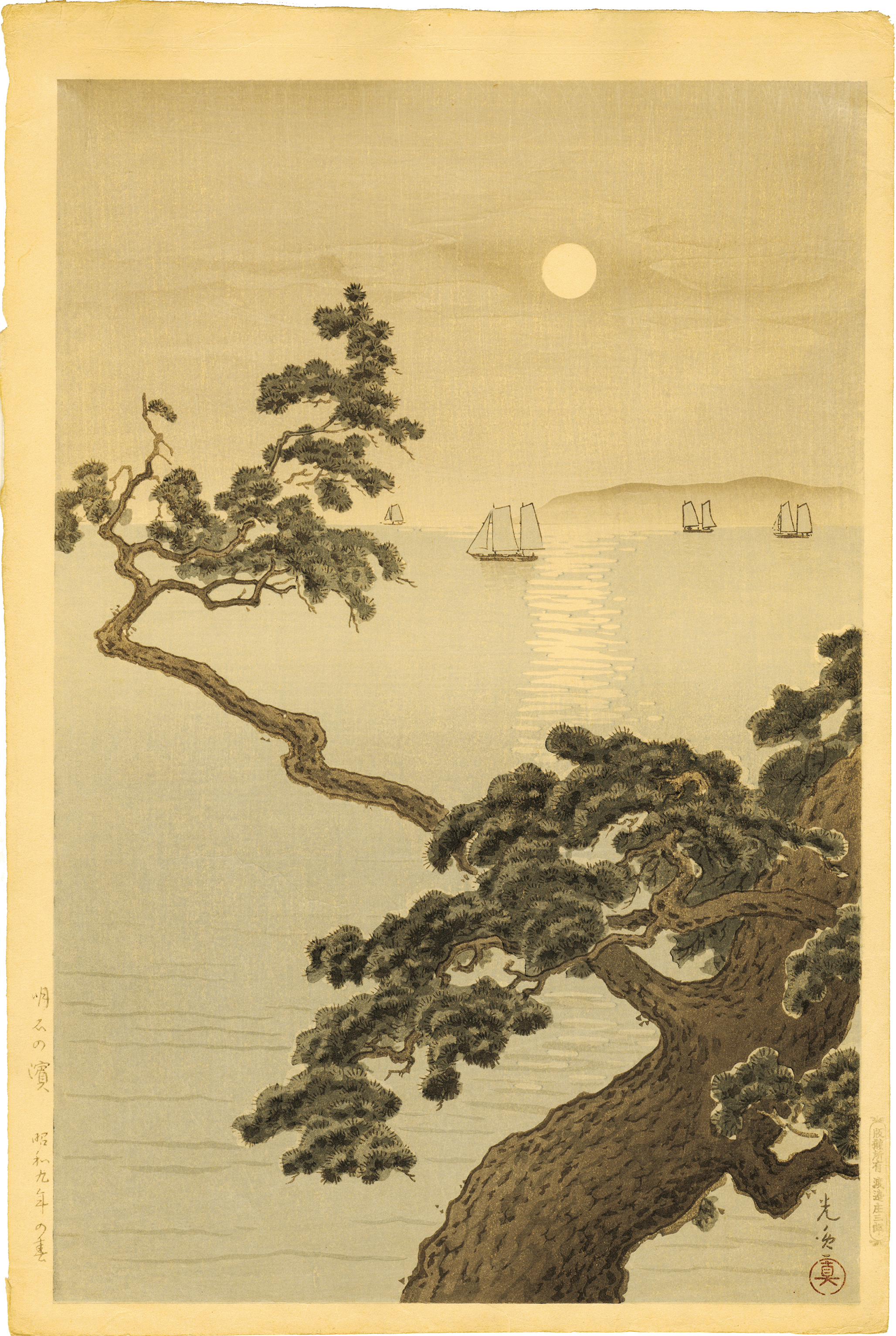 Since TSUCHIYA Koitsu was the youngest pupil of Kiyochika, he was like a family of Kiyochika. He assisted Kiyochika's artworks and also did housework, for instance, babysitting. In 1931, he met Watanabe Shozaburo, the most famous Shin-Hanga publisher, at the exhibition on the 16th year of Kiyochika's death. Watanabe offered him to make Shin-Hanga works, Koitsu joined and created some works and exhibited "Night cherry blossom at Gion" and "Moonlit Evening at Osaka Castle" at the 3rd exhibition of Modern print which was sponsored by Watanabe. It was the late debut of the famous Shin-Hanga artist. Shopping Guide & Information of the Japanese Prints