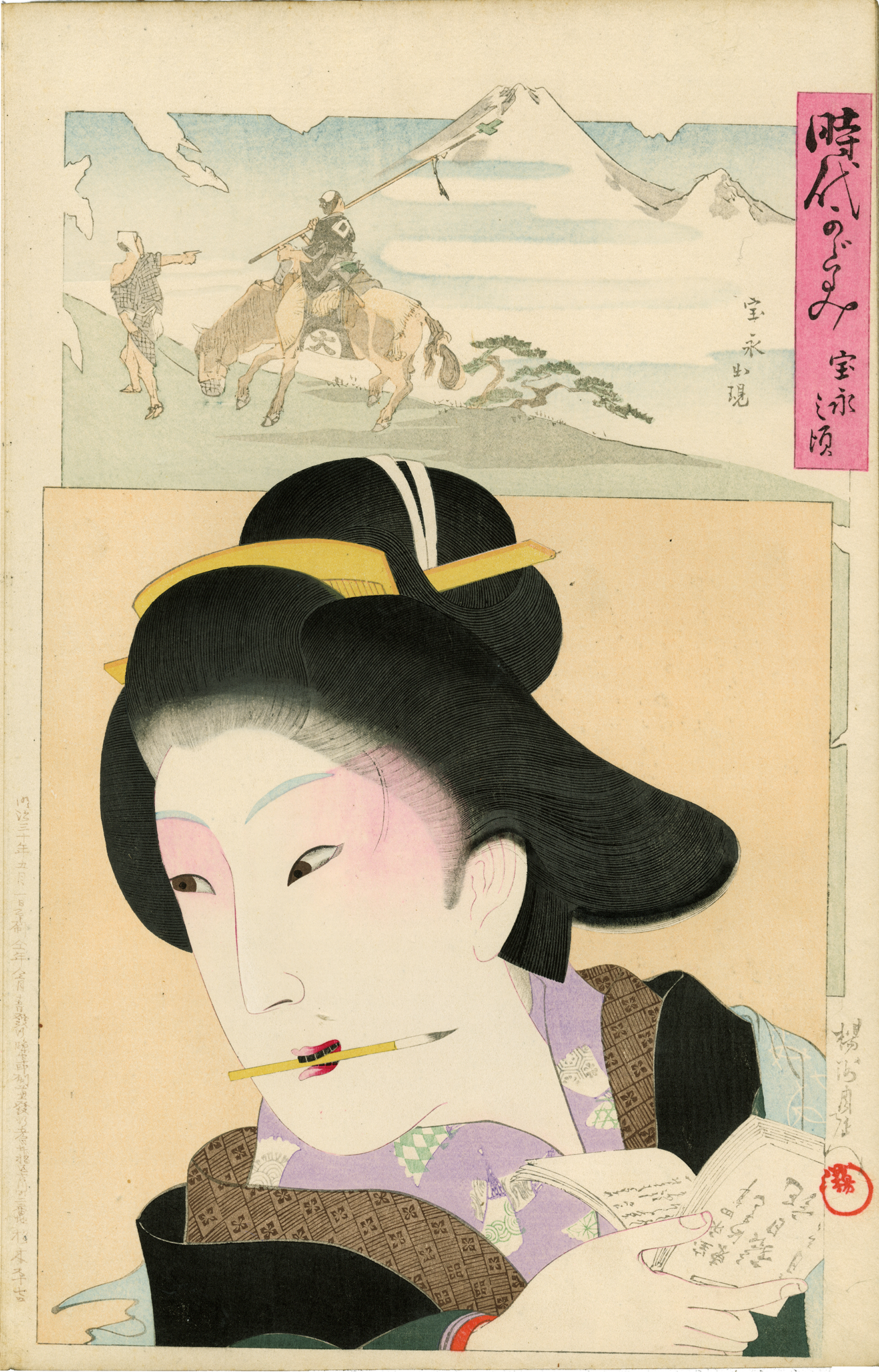 He was famous for the motif of beauties, however, one of the seeds that grow into a flowering of his art-life was the warrior prints and war prints of the Seinan War. After that, he started creating the artworks of Ooku, the shogun's harem, and the lady portrait in the civilization of the Meiji era. It raised his reputation. People had called his artworks "The second Edo Ukiyo-e", and he was one of the most popular artists whose motif is beauty.