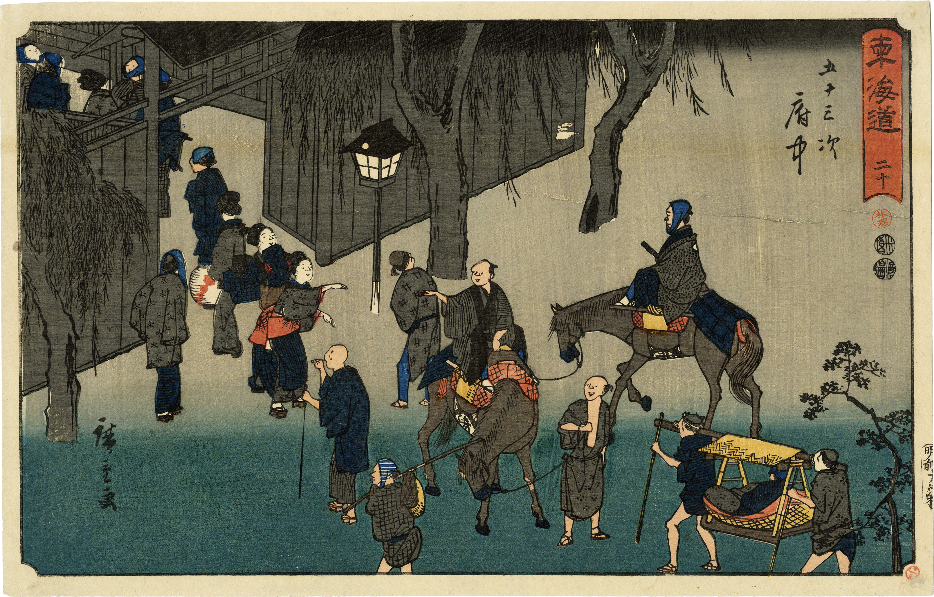 Hiroshige presented ""53 Stations of the Tokaido Road"" from 1833, by the publisher Hoei-Do, and later, published this Reisho version from 1847 - Reisho is one of the Japanese fonts. The series consists of 55 prints that depict the scene in the journey from Edo to Kyoto that includes 53 stations. Citizens in the Edo-era enjoyed the journey scenery and cultures of each place, and it achieved significant popularity. Shopping Guide & Information of the Japanese Prints"