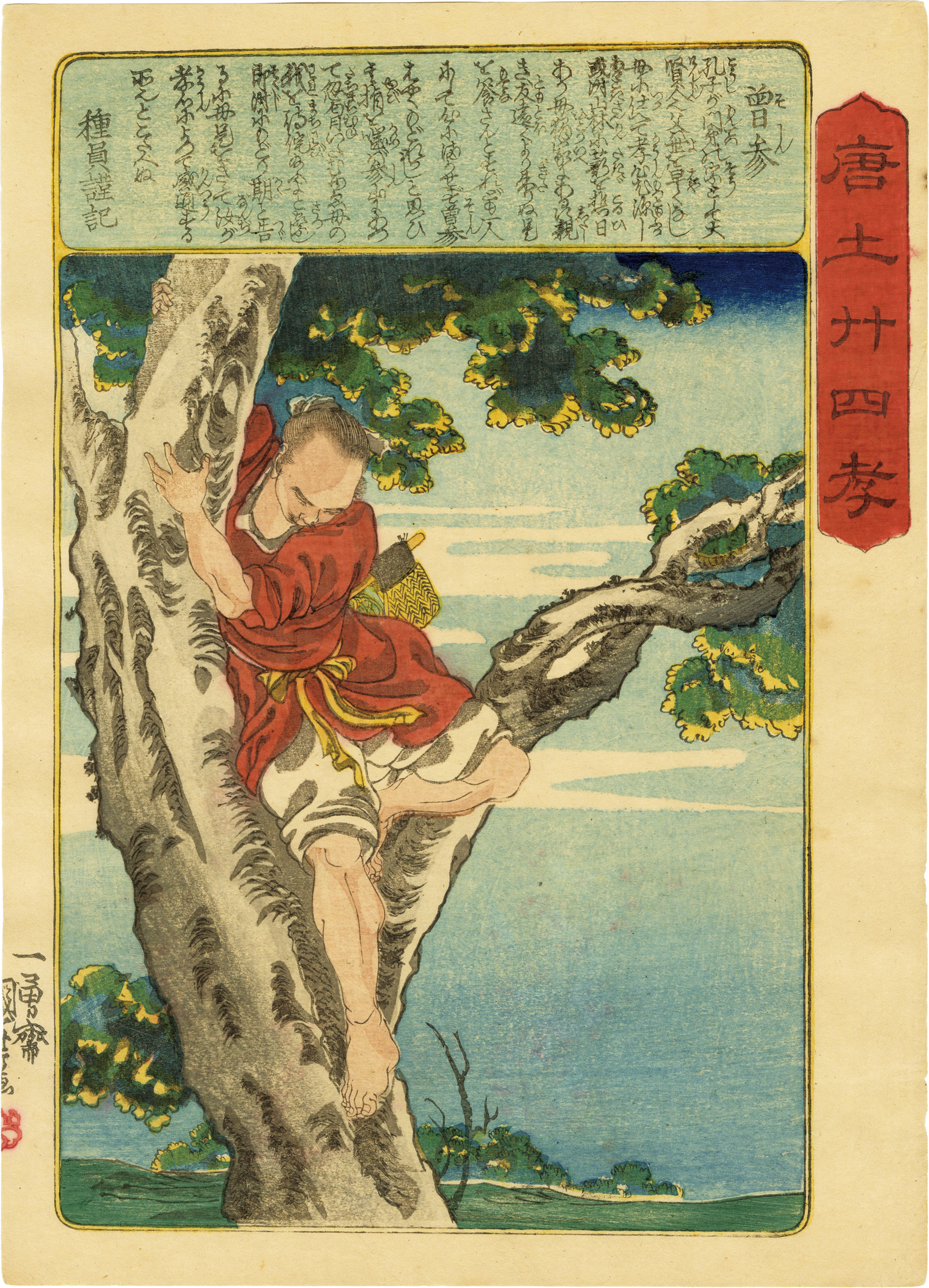 風景画としての意識が強い「二十四孝童子鑑」に対して、国芳が後に手がけた「唐土廿四孝(もろこしにじゅうしこう)」は、人物を主体としている。油彩画や銅版画を念頭においた洋風表現を用い中国の有名人物を描くことを本シリーズの主眼としていたようだ。