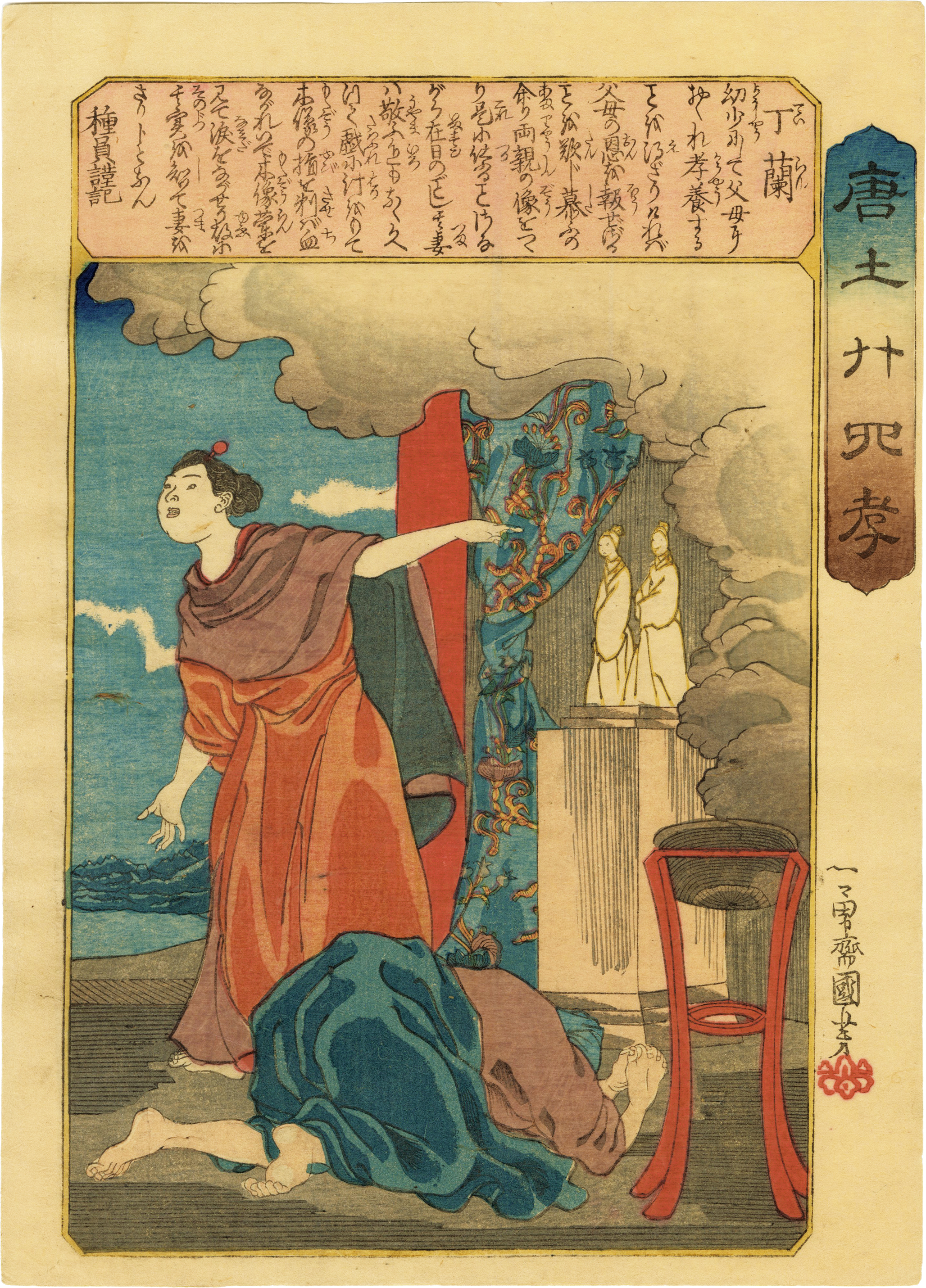 In contrast to the "二十四孝童子鑑," which were more consciously intended as landscapes, Kuniyoshi's later work, "唐土廿四孝," focuses mainly on people. The main focus of this series seems to have been to depict famous Chinese figures using Western-style expression with oil painting and copperplate engraving in mind.