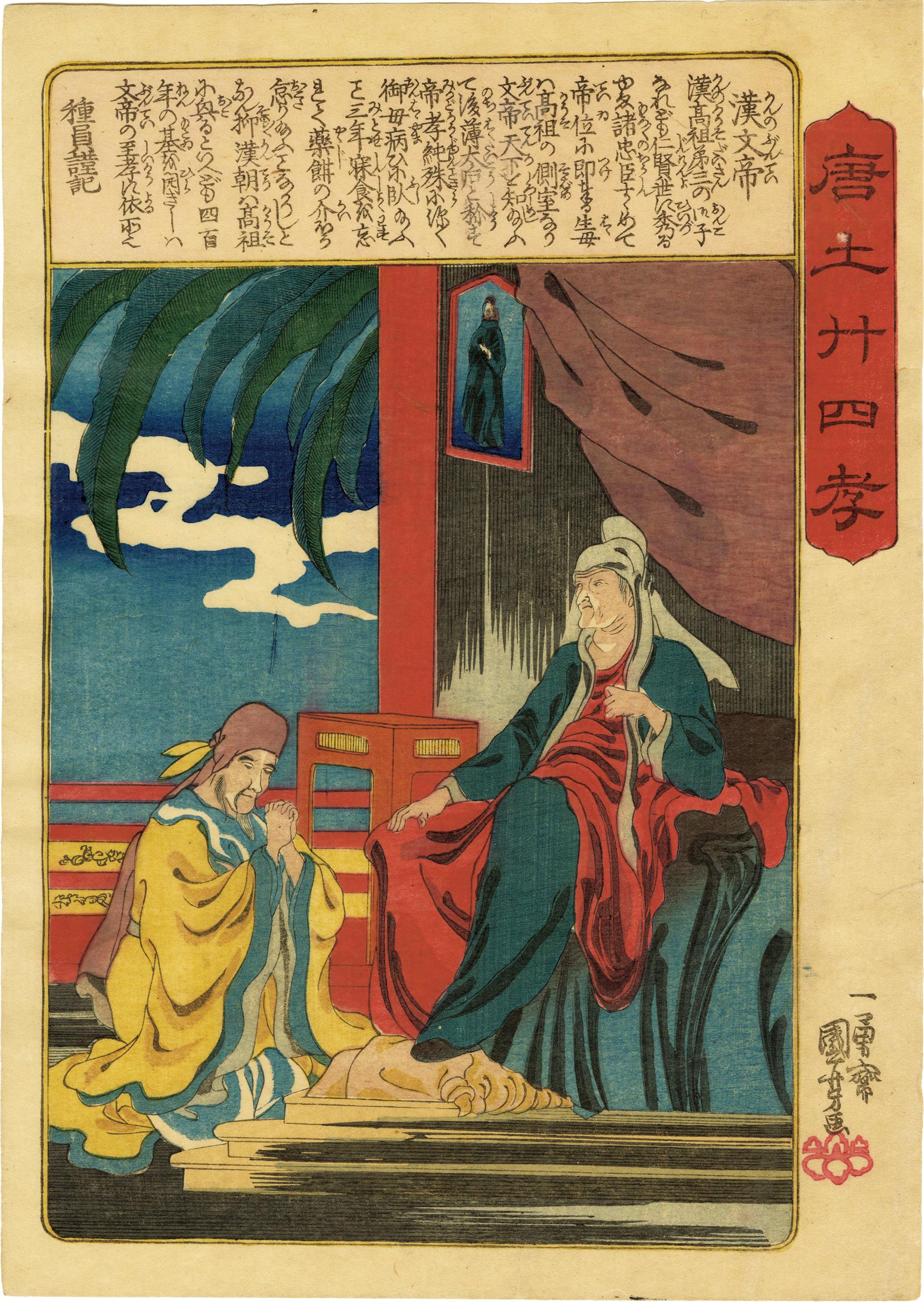 風景画としての意識が強い「二十四孝童子鑑」に対して、国芳が後に手がけた「唐土廿四孝」は、人物を主体としている。油彩画や銅版画を念頭においた洋風表現を用い中国の有名人物を描くことを本シリーズの主眼としていたようだ。