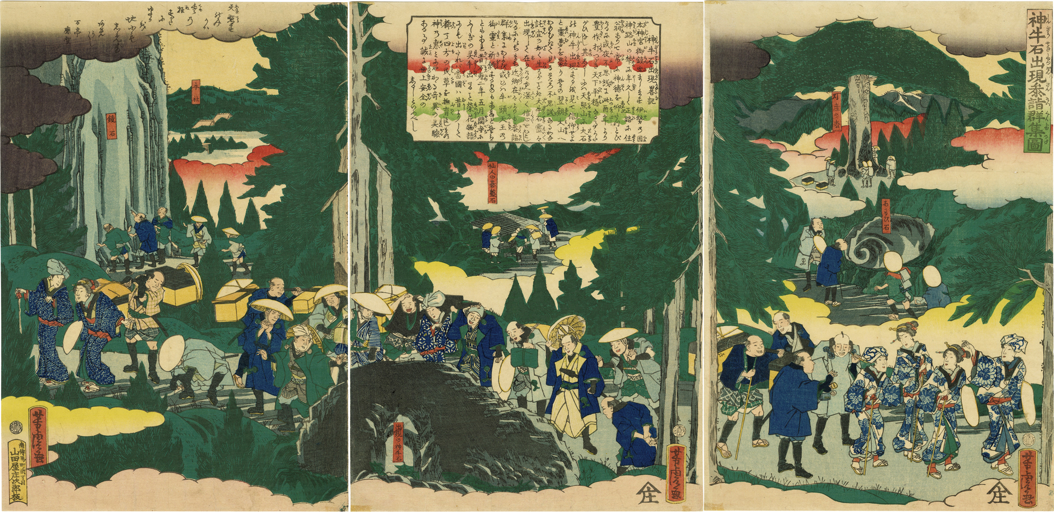 The text in this work states that this sacred cow stone appeared when an older man from the Land of Ise saw it in a dream. The commentary sign at the Saguri Shrine tells about that legend in the original words of that time "Whenever there is a disturbance in the world, a drop of sweat drips from this stone, and it is truly a strange stone that reveals the divine."