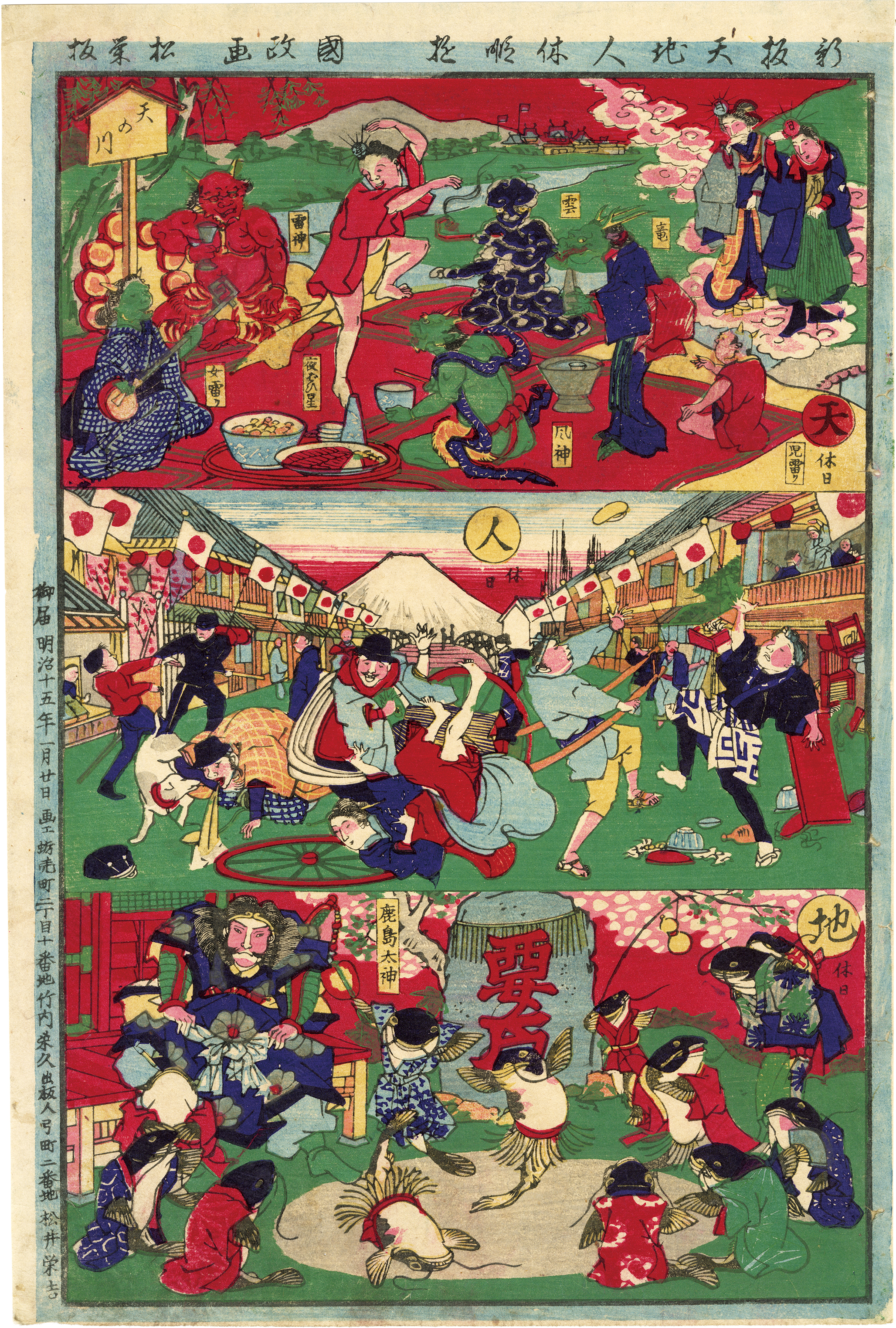 Heaven, earth, and people enjoying their respective holidays. In heaven, the gods have a feast in the Milky Way, and catfish are wrestling at the Kashima Shrine on earth. And people are having a banquet in Nihonbashi? Shopping Guide & Information of the Japanese Prints