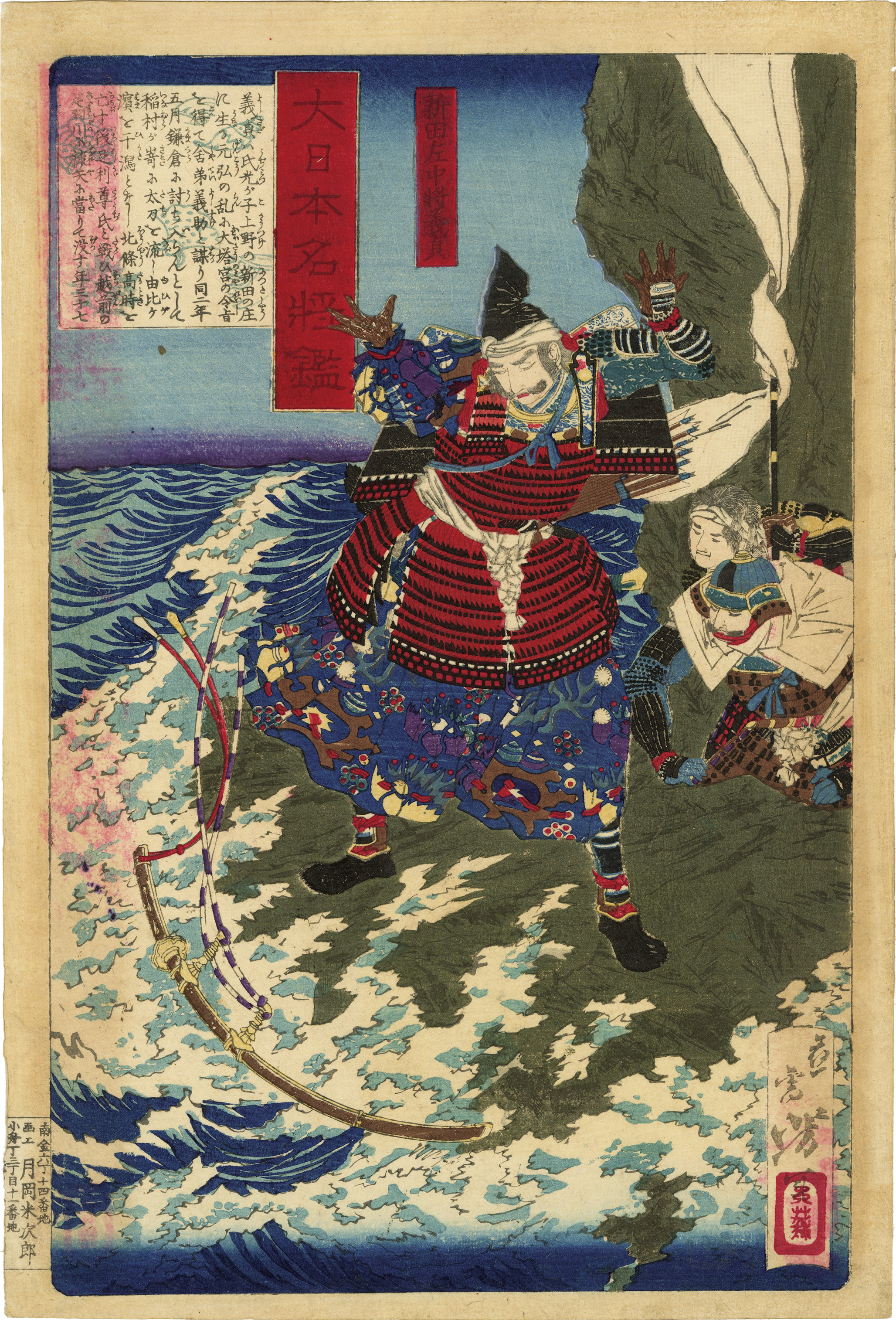 後醍醐天皇の命により、新田義貞は鎌倉幕府滅亡に向けて進軍していた。その新田のある伝説を描いたのがこちらの作品。金の太刀を龍神に奉じている一場面である。鎌倉は三方を山、一方を海に囲まれた難攻不落の地であり、攻め入る新田も苦戦を強いられていた。伝説では、新田が太刀を奉じるとたちまち海が干上がり陸路が姿を現して、見事鎌倉に攻め入ることに成功したとある。一説によるとこれは干潮の時期を見計らった新田の一芝居で、兵士を鼓舞し力を与えるためであったのではないかと考えられている。