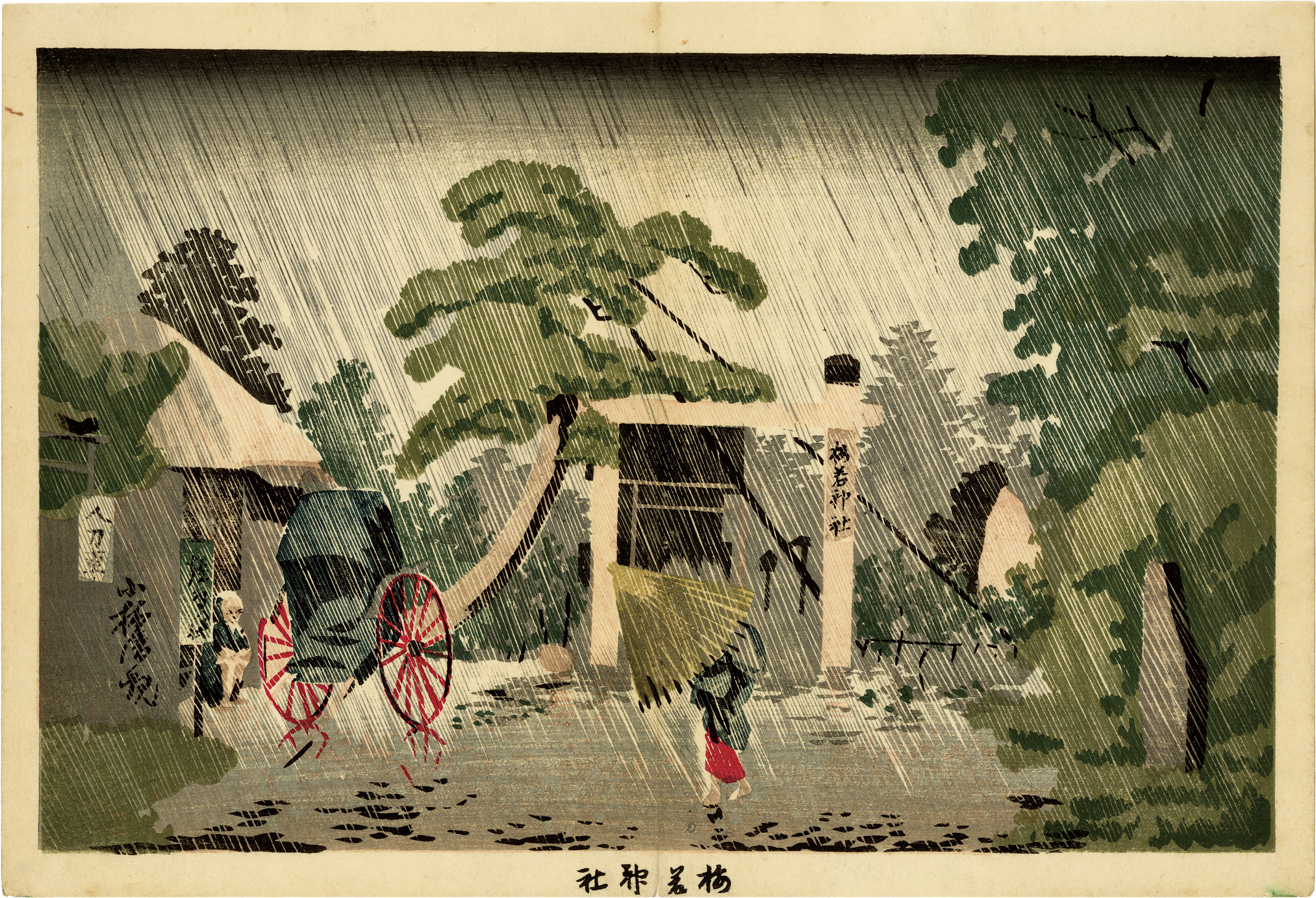 叩きつけるような雨の表現が特徴的で、激しい雨によって霞む風景が見事に表現されている。