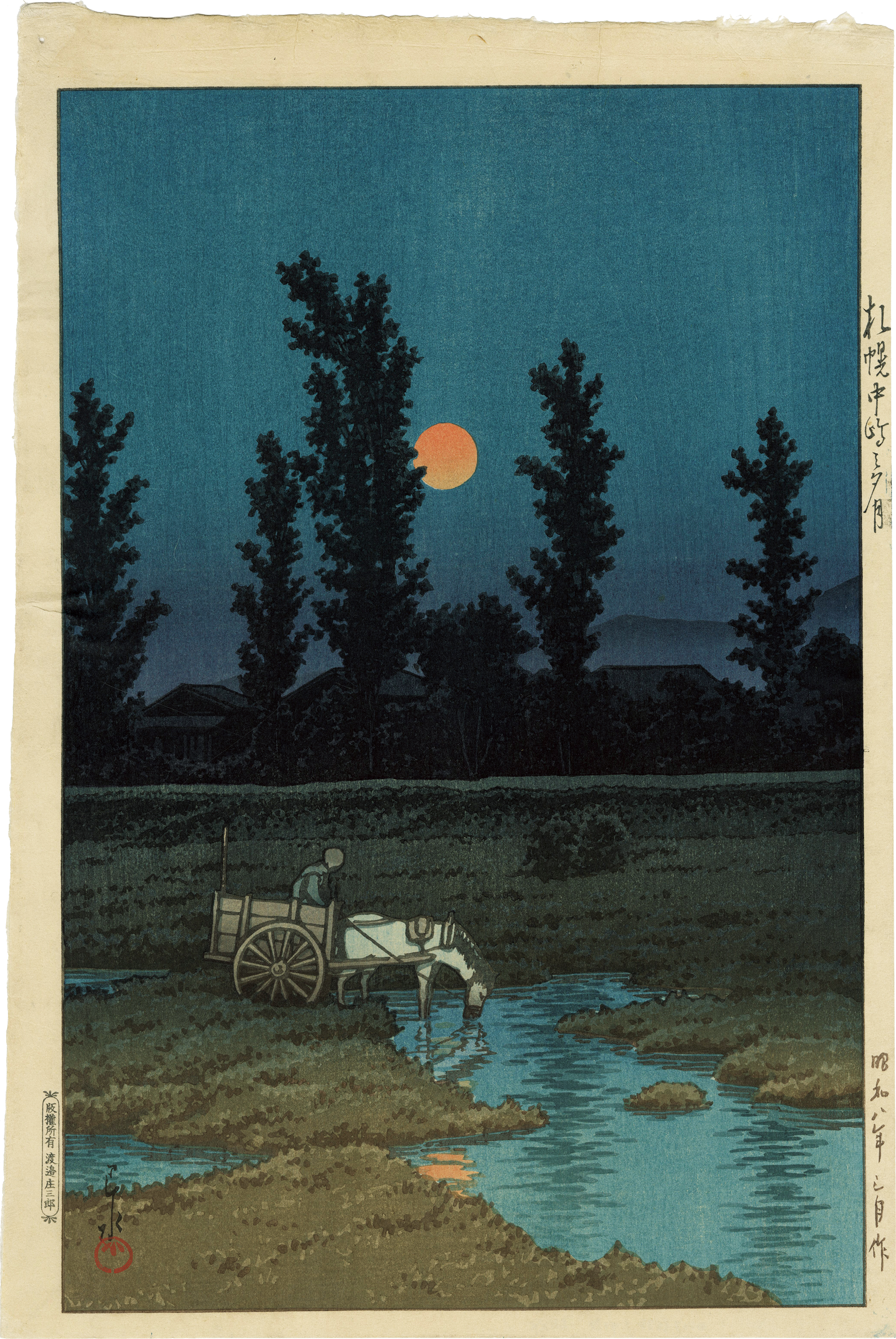 KAWASE Hasui was initially active as a Japanese painter but switched to printmaking artist by being impressed by ITO Shinsui's woodblock artwork "Eight Views of Omi," published in 1918.