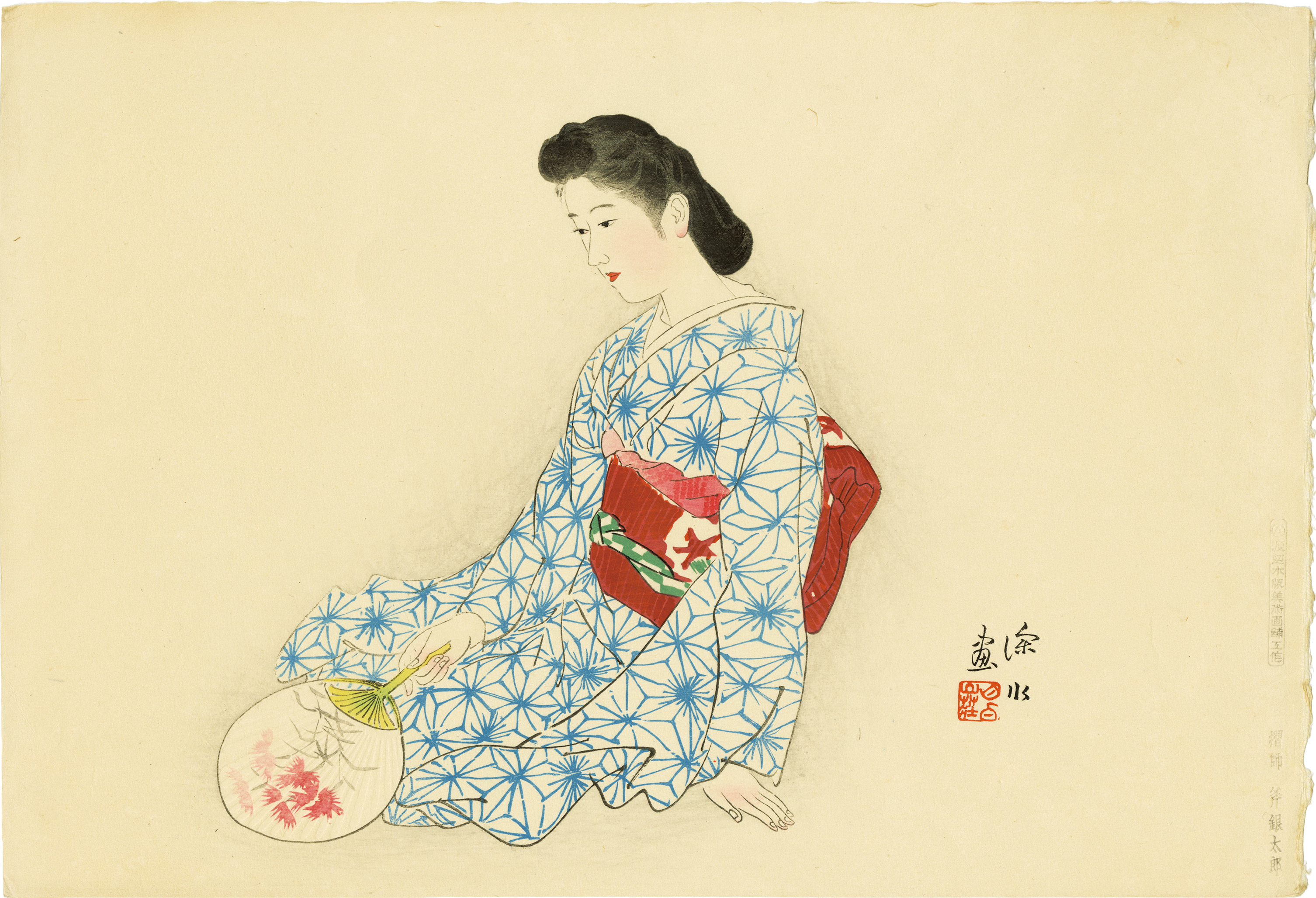 In 1916, when Ito Shinsui was 18 years old, an exhibition of the pupils of Kiyokata was held. Shinsui exhibited "Woman Looking in a Mirror" at the exhibition, and it fascinated Watanabe Shozaburo. Then Watanabe decided to start making woodcut print works of Shinsui, and later, he produced over 130 printworks from 1916 to 1960. Shopping Guide & Information of the Japanese Prints