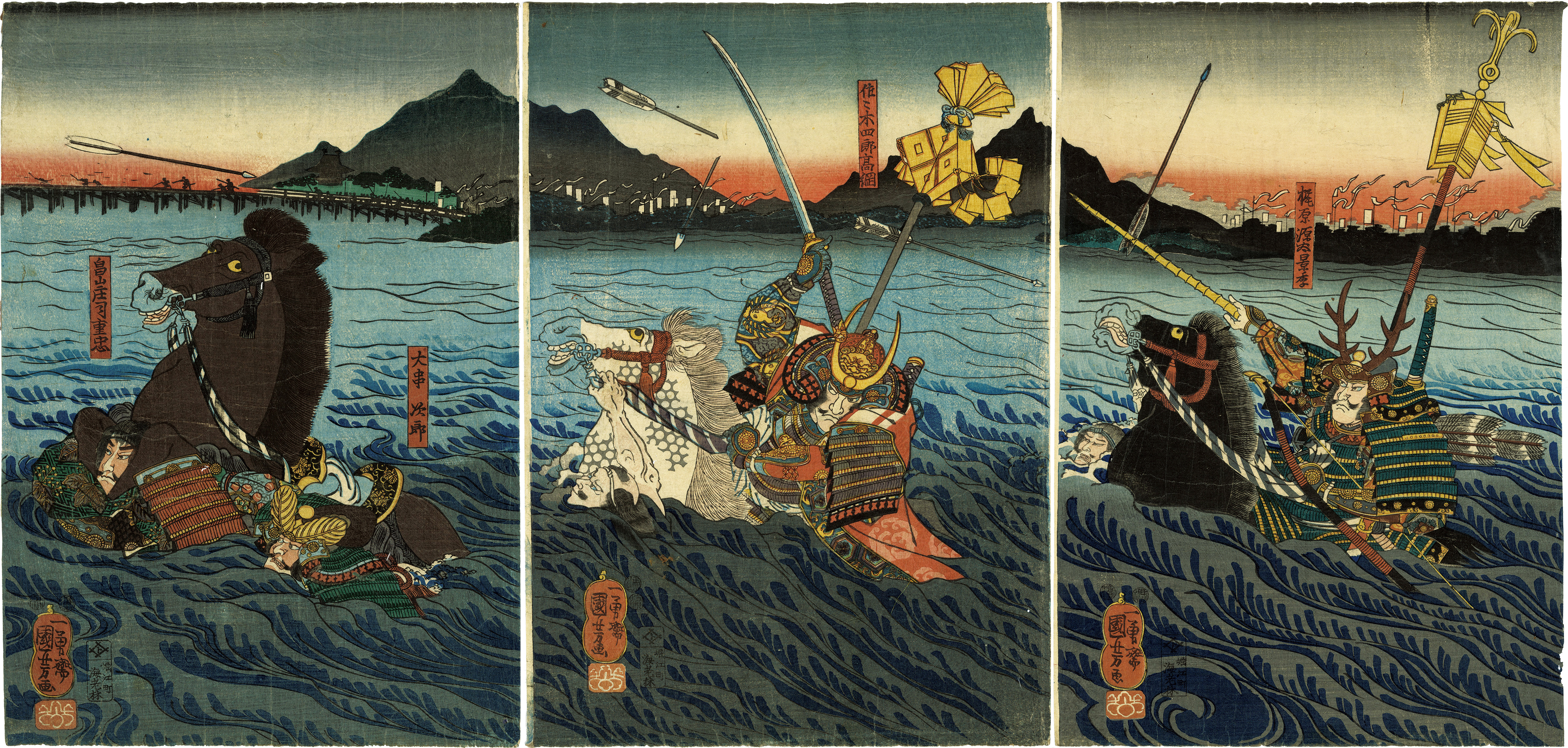 The two warriors vying for the lead in front of the Uji River were Sasaki Shiro Takatsuna and Kajiwara Genta Kagesue. Takatsuna, riding the famous horse "Ikezuki" given to him by Yoritomo, wanted to lead the battle at all costs. Takatsuna, riding Surusumi, a famous horse given to him by also Yoritomo, wants to lead the way at all costs, so he calls out to Kagesue that his horse's girth is loose. He hurriedly tightens the belt. Takatsuna passes him and jumps into the river. The most famous horse of the day, "Ikezuki," crosses the fast flowing Uji River to the other side of the river in a single powerful movement.