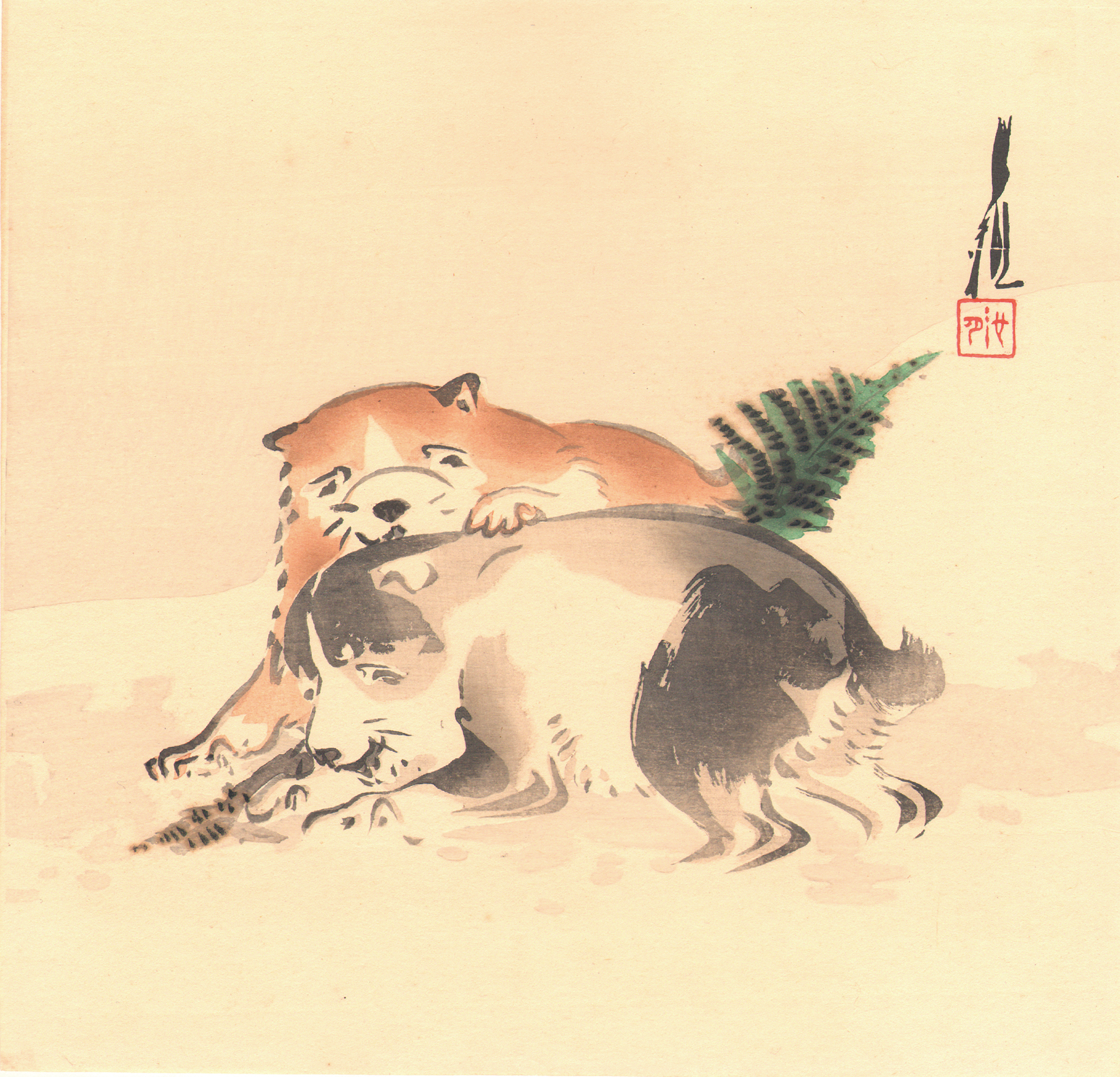 くったりと重なる子犬が2匹。子犬らしい愛嬌のある仕草が丁寧に描かれている。