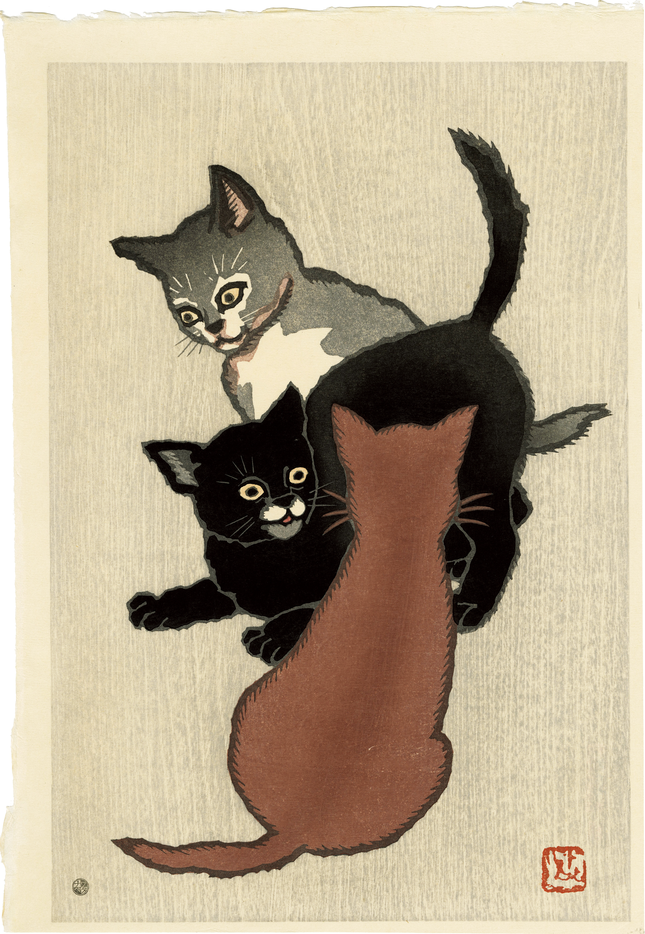 While Natori Shunsen's dynamic actor pictures come to mind, this is a rare work depicting very lovely cats. In 1928, five woodblock prints of cats and puppies were published by Watanabe Print Shop in a series " Five Styles of Dog and Cat ".