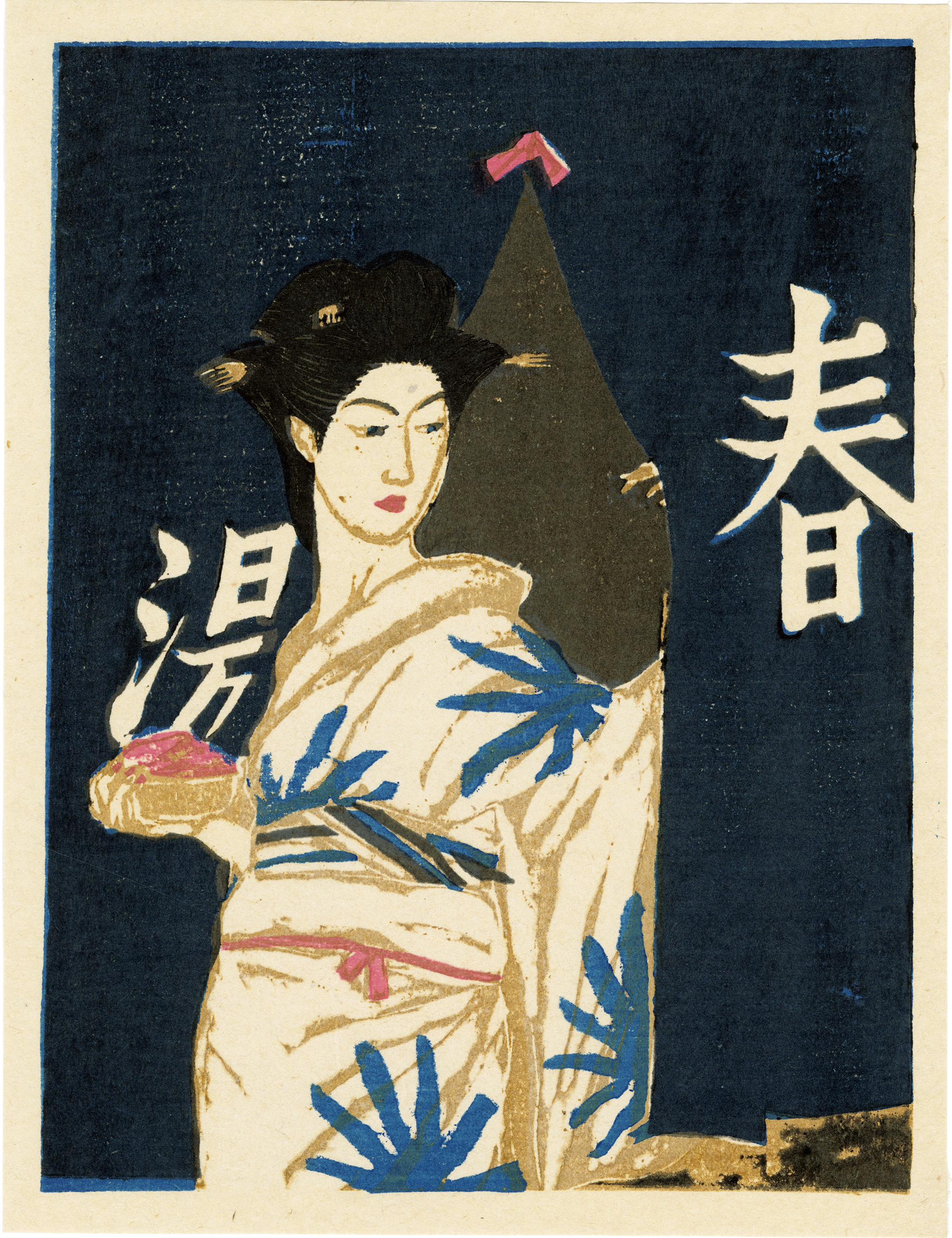 働く女、都会の女、湯上がりの女など、複数の絵師が様々な日本の女の様子を描いた版画集「日本女俗選」の内の一枚。昭和21年に作家が自画自刻した版をもって高見澤木版本社が手摺したもの十葉を収め、富岳本社が刊行した。すべて中判サイズ(おおよそ26.5×19.5cmほど)で制作されている。