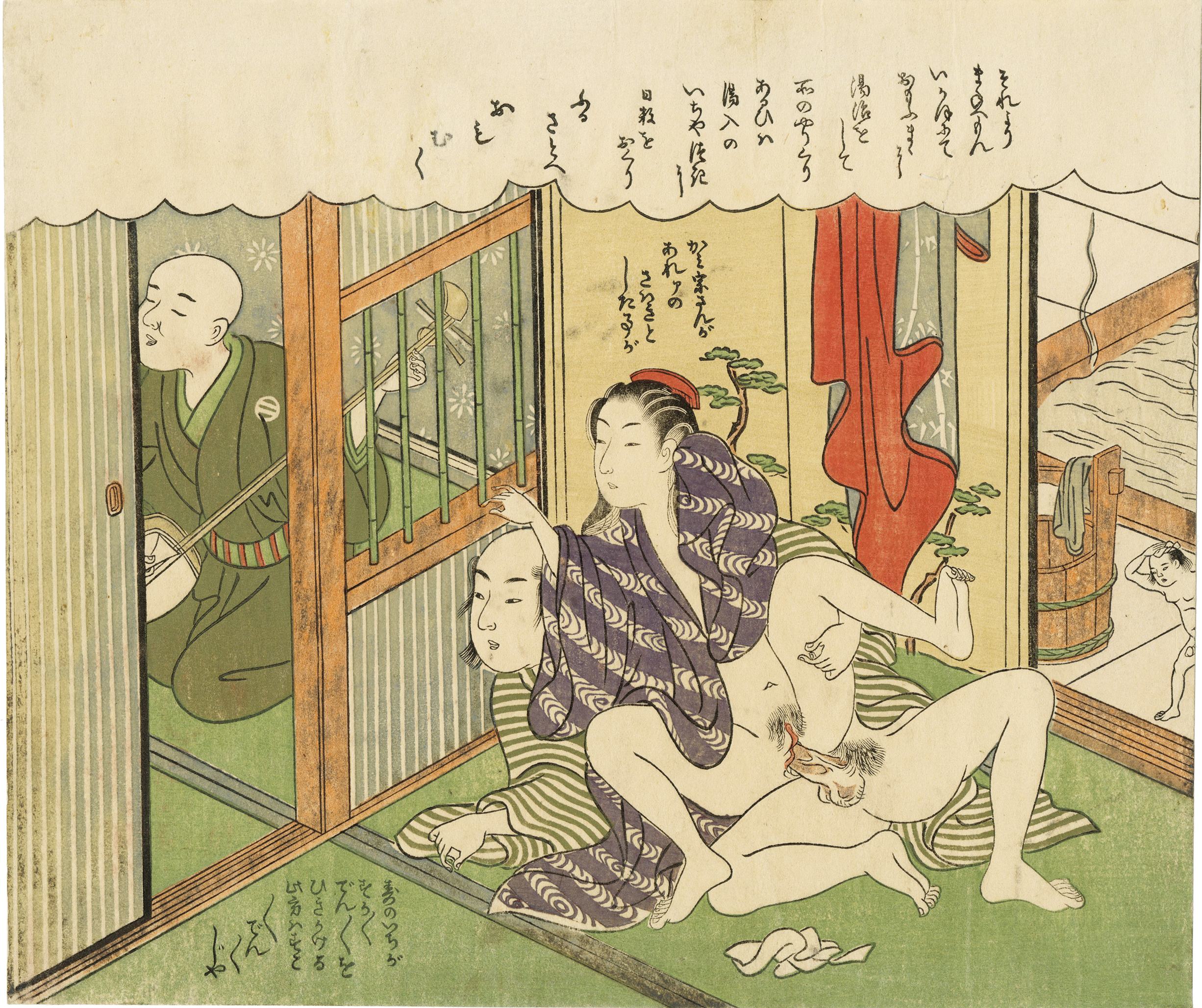 Suzuki Harunobu was an innovator, the first to produce full-color prints in 1765, rendering obsolete the former modes of two- and three-color prints. Harunobu used many special techniques and depicted various subjects, from classical poems to contemporary beauties. Like many artists of his day, Harunobu also produced a lot of shunga. During his lifetime and shortly afterward, many artists imitated his style.