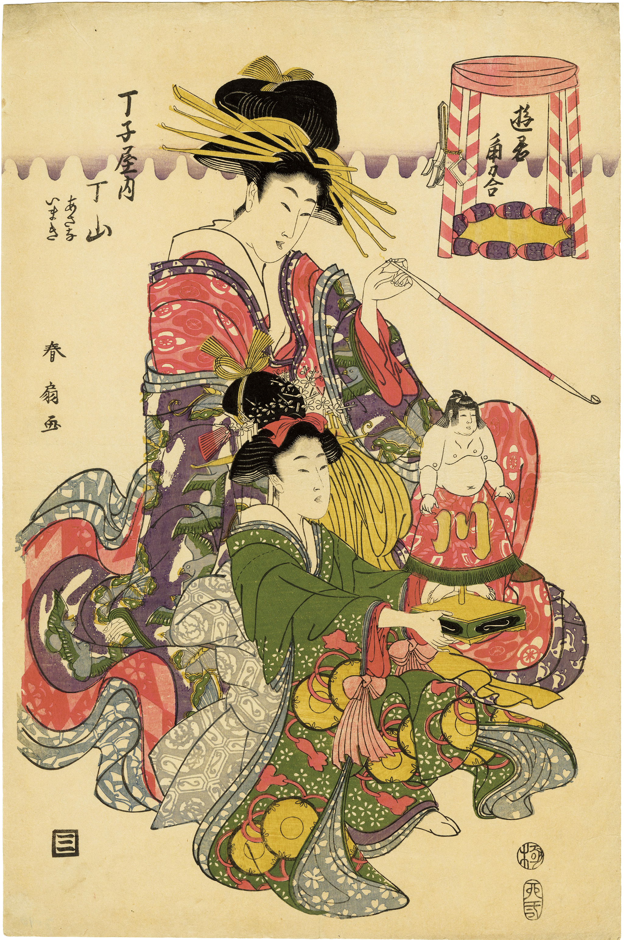This piece is from a series that combines a courtesan with objects related to sumo.