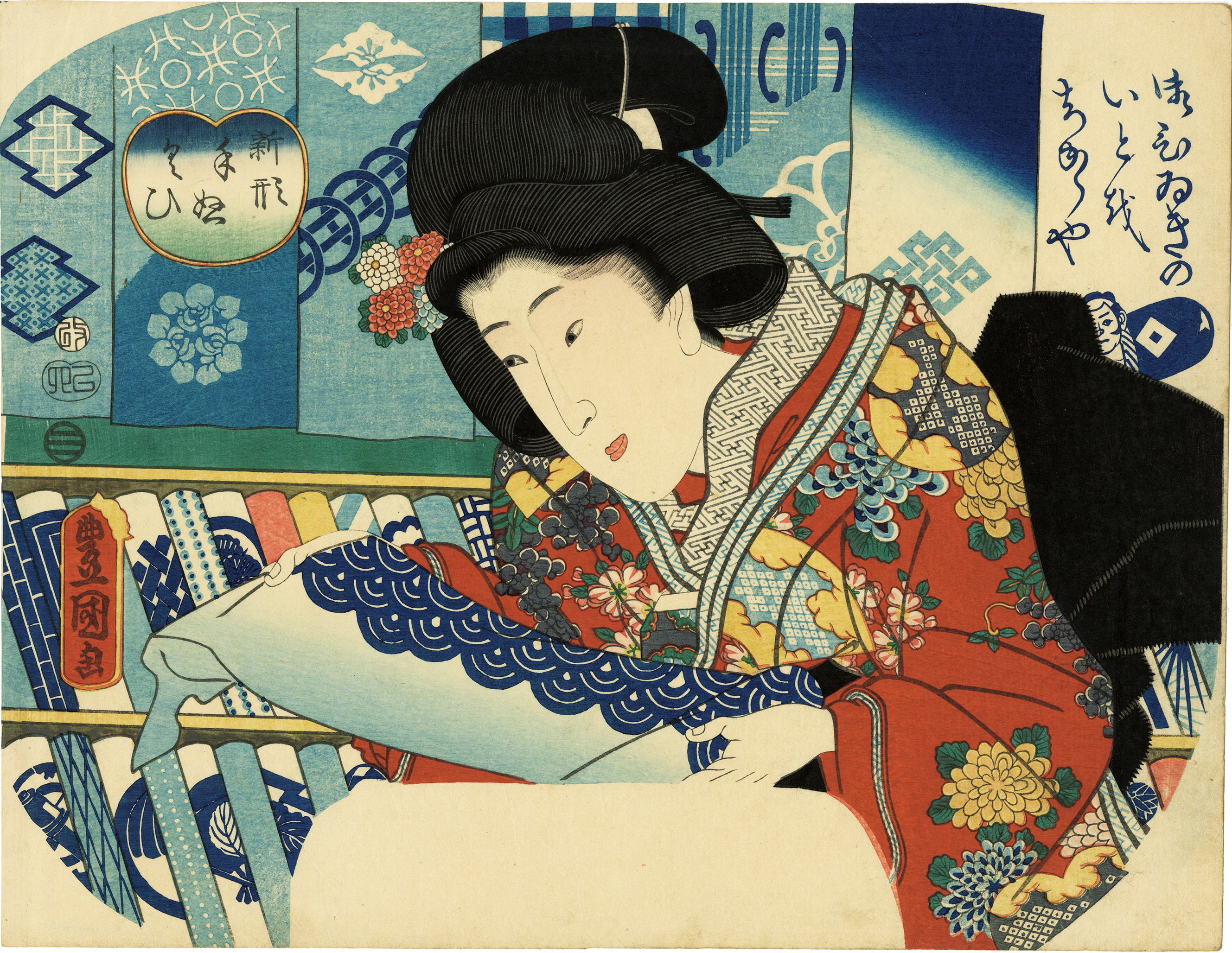 華やかな着物を身に纏い、広げるのは美しい手ぬぐい。買い物を楽しむ美人を描いている。