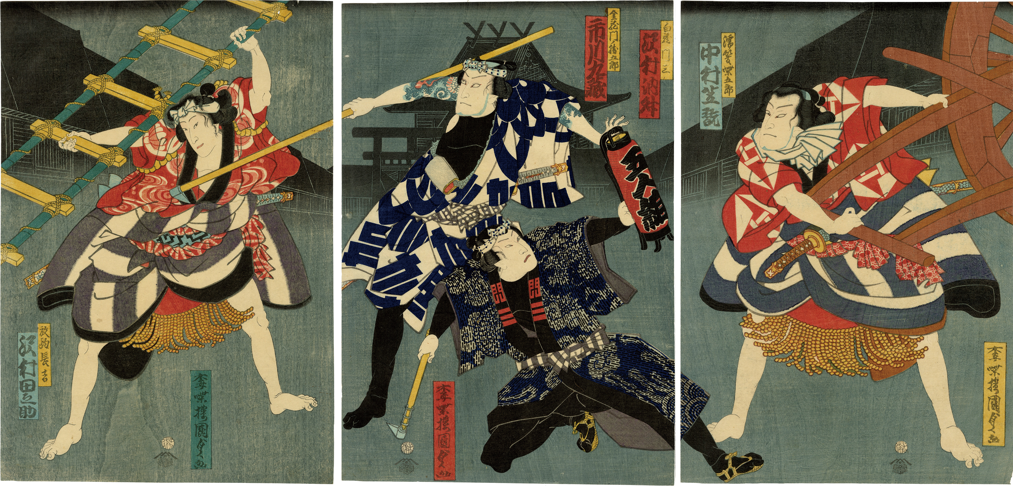 It depicts a scene between amateur sumo wrestler Hanaregoma no Chokichi and sumo wrestler Nuregami Chogoro in the scene of the sumo wrestling match, combined with a fight between firefighters.