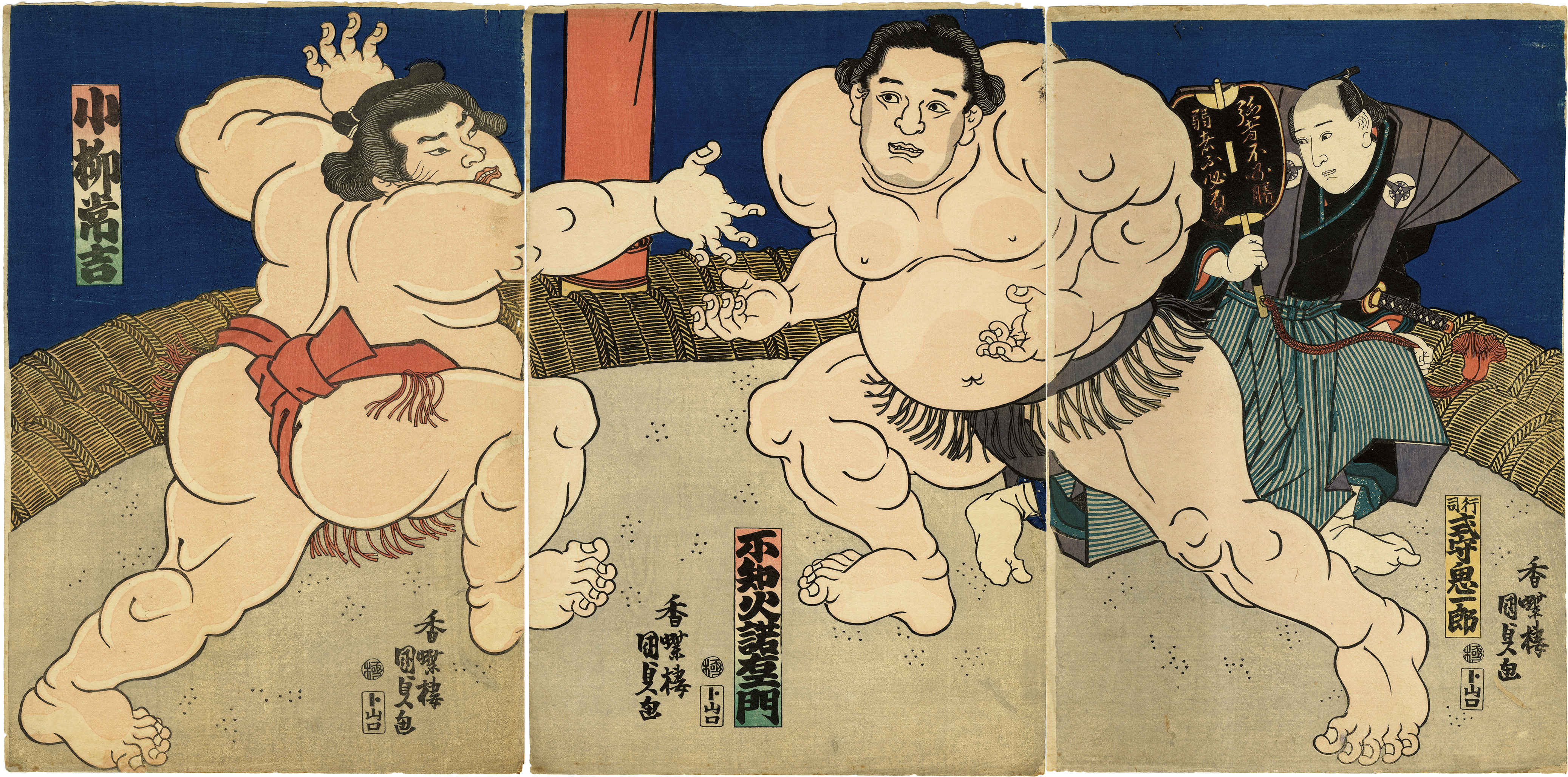 不知火諾右エ門と小柳常吉による、迫力満点の相撲の取組が描かれた作品。