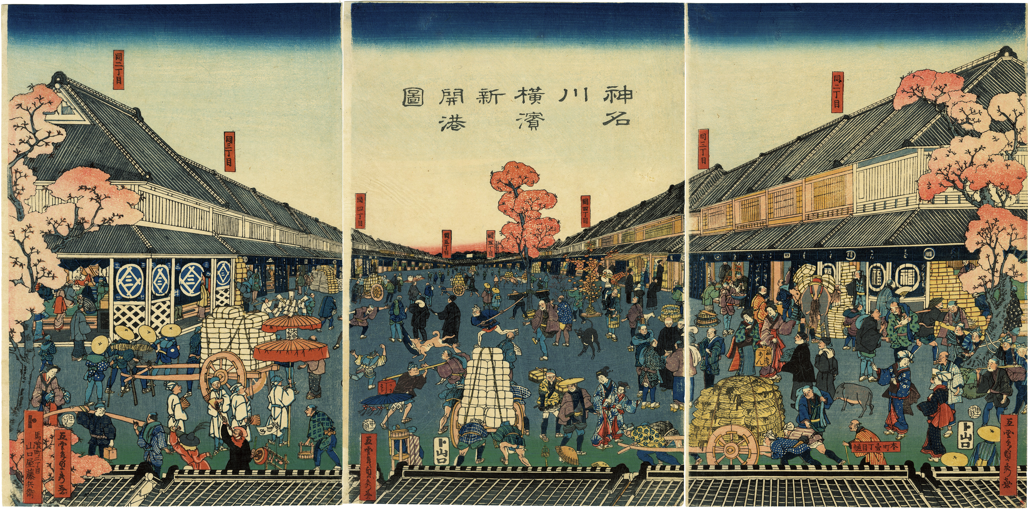 安政6年(1859年)、長きにわたる鎖国を終えて開港された横浜港。町は活気にあふれ、様々な商売を行う人々が集った。掲載作品には、横浜本町4丁目あたりが描かれている。左図に描かれている「三」の文字の店は、幕府から要請を受けて横浜店を開店した三井越後屋(現在の三越)である。賑わいを見せる通りでは、様々な出来事がまき起こり、歩みを進める人々もどこか楽しそうに見える。