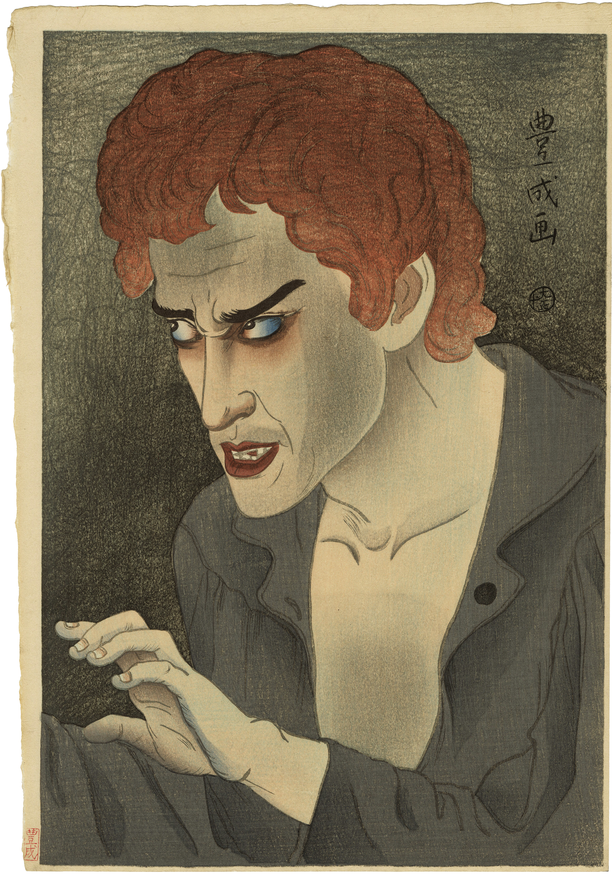 "Stars of Kabuki (Rien no Sono)" is a series depicting popular kabuki actors of the time in twelve works. This particular work is based on the December 1920 production at the Yurakuza Theatre, which was a translated play of "Les Misérables." In this piece, Jean Valjean's piercing gaze embodies the anguish and curse against the injustices of the world.
