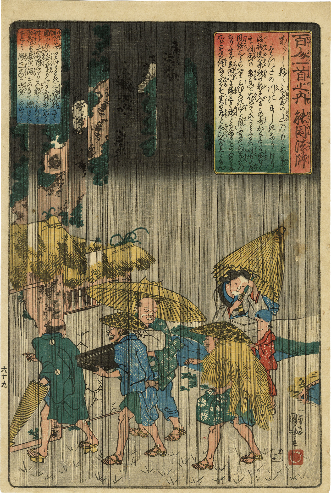 One piece from a series that captures striking scenes inspired by the Hyakunin Isshu, a classical anthology of one hundred waka poems.