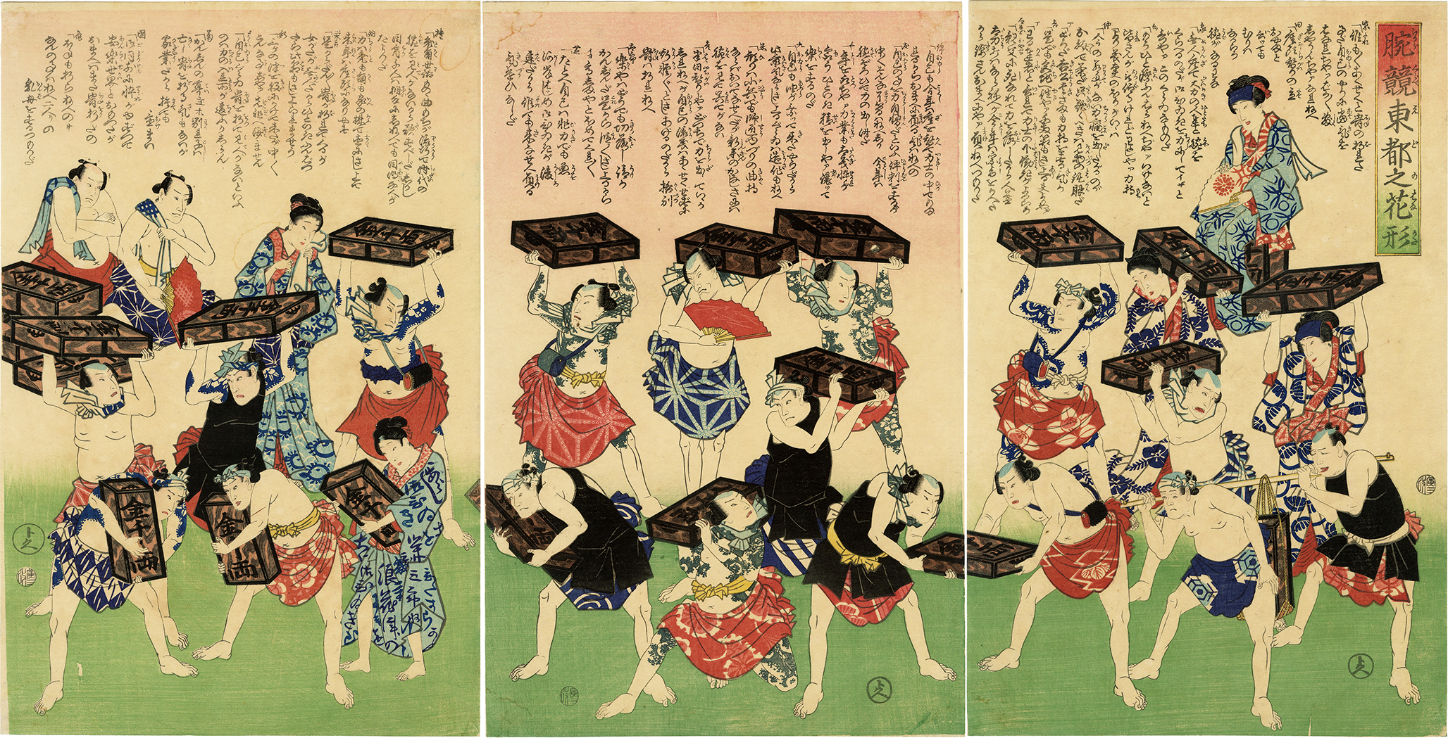 This is an unsigned (anonymous) work, featuring figures with tattooed bodies and holding gold coin boxes, alongside a role-player’s reputation chart, reflecting the customs and culture of late Edo period. The people holding the gold coin boxes, combined with the title “Competition, Star of the Eastern Capital,” suggest that the work addresses themes of wealth and social ranking competition.
