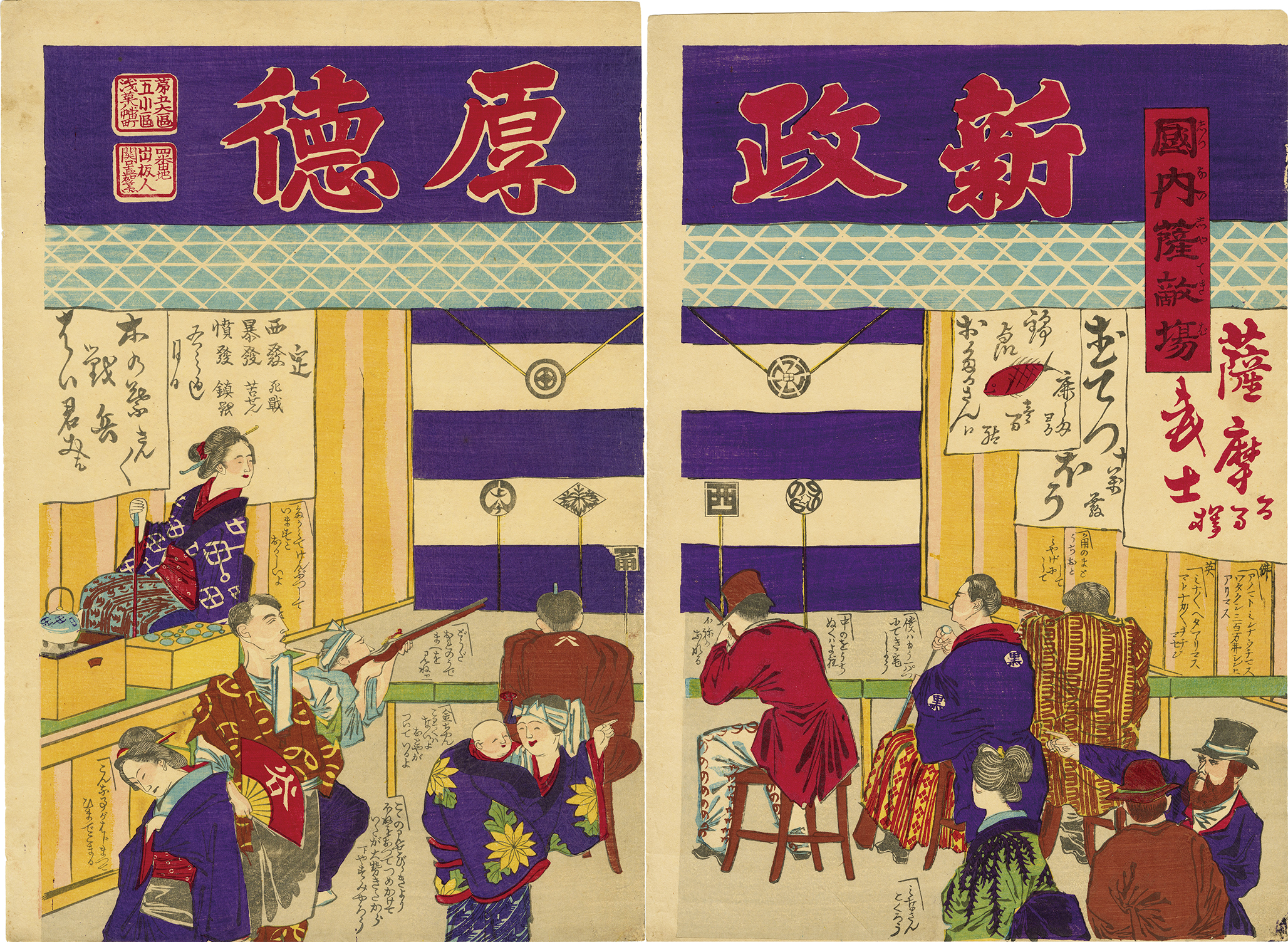 This is a two-panel work created around the time of the Meiji Restoration. The scene of the shooting range implies to the Satsuma Rebellion, depicting the battle between the government forces and the Satsuma army led by Saigo Takamori. Notably, the figures representing the new government forces are distinguished by their use of firearms.