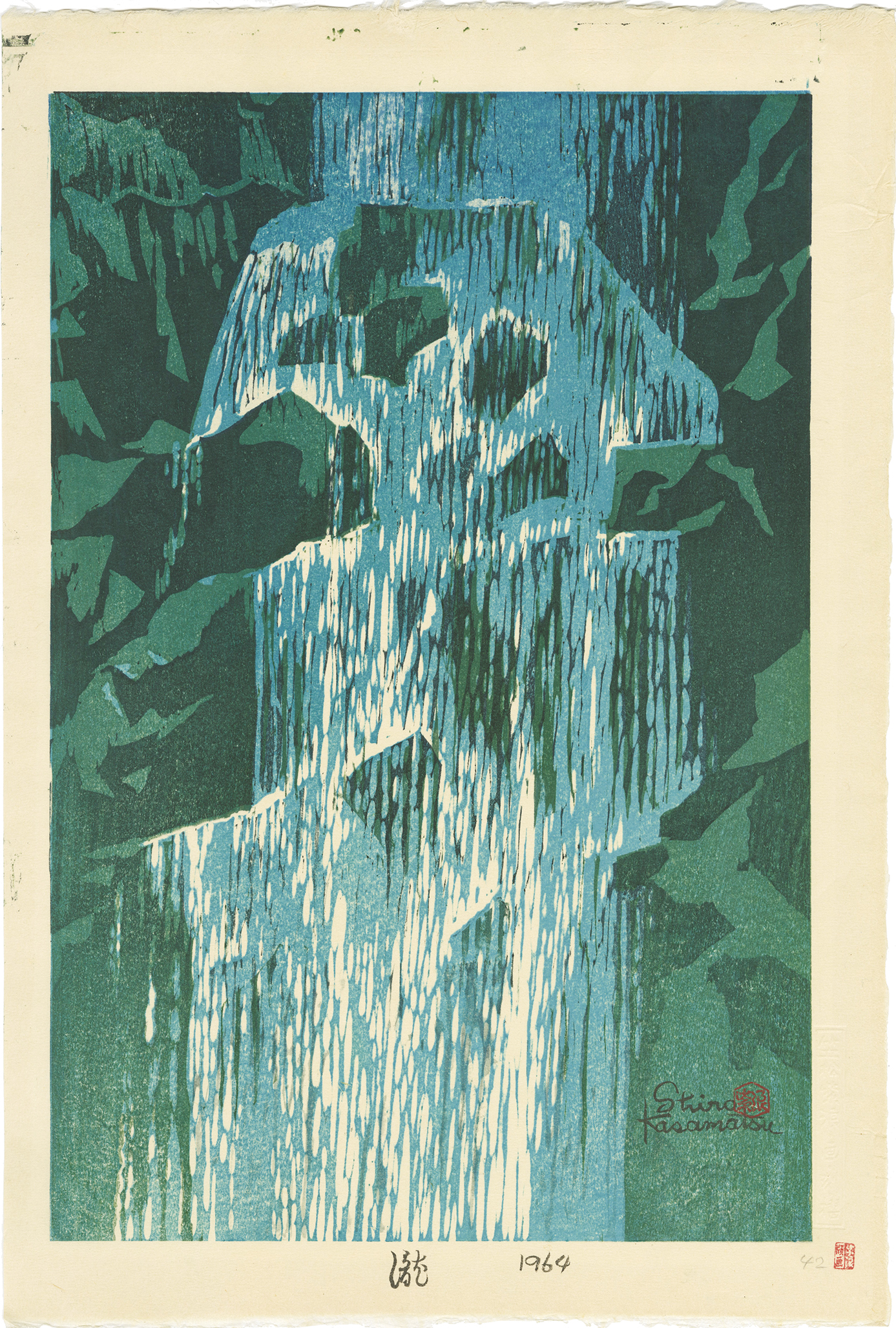 In Japan, woodblock prints based on the division of process had long been mainstream. Still, around the end of the Meiji period, a creative printmaking movement emerged in which the artists performed all the process. Kasamatsu Shiro also began to produce self-carved and self-printed prints around 1955, creating about 120 works until 1990. This work is one of them, and it has a different taste from those produced through a publisher.