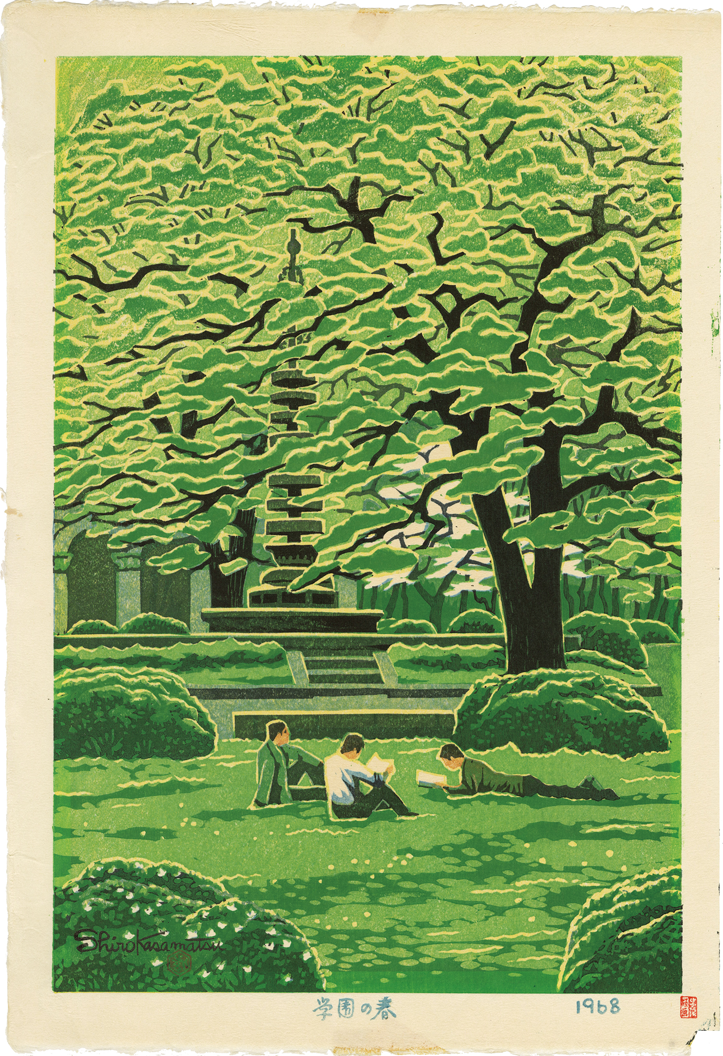 In Japan, woodblock prints based on the division of process had long been mainstream. Still, around the end of the Meiji period, a creative printmaking movement emerged in which the artists performed all the process. Kasamatsu Shiro also began to produce self-carved and self-printed prints around 1955, creating about 120 works until 1990. This work is one of them, and it has a different taste from those produced through a publisher.