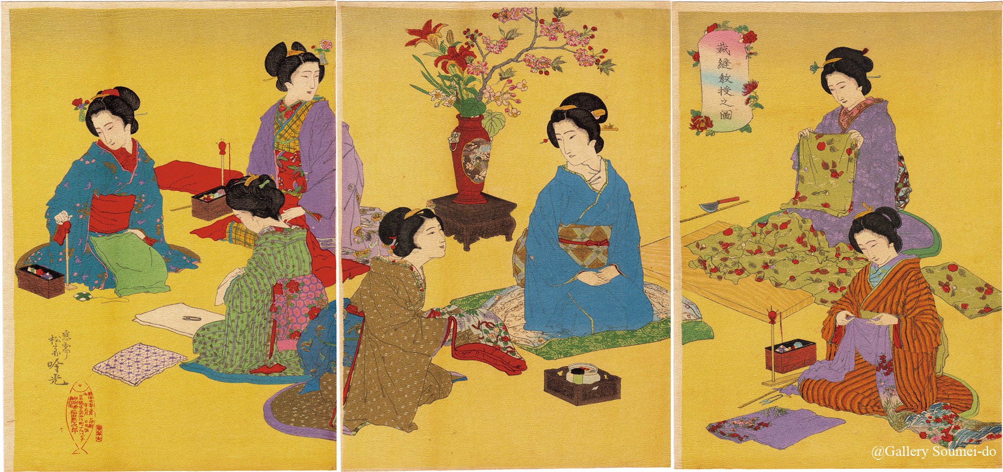 Sewing, once practiced as a form of household accomplishment, gradually took on the character of vocational training with the development of the education system in the Meiji period. The woman in the blue kimono at the center is likely the teacher.