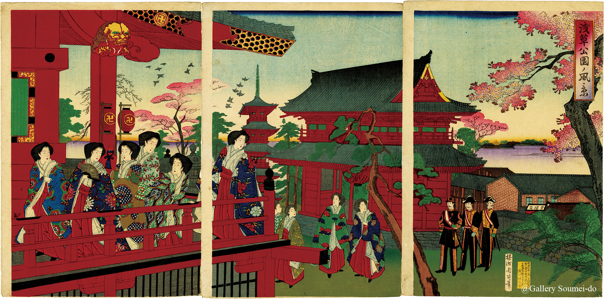 朗らかに談笑する女性たちの姿が実に華やかで、それらを手前左端に配した大胆な構図が印象的である。春の浅草寺のにぎわいや明るい雰囲気が伝わってくる一枚。