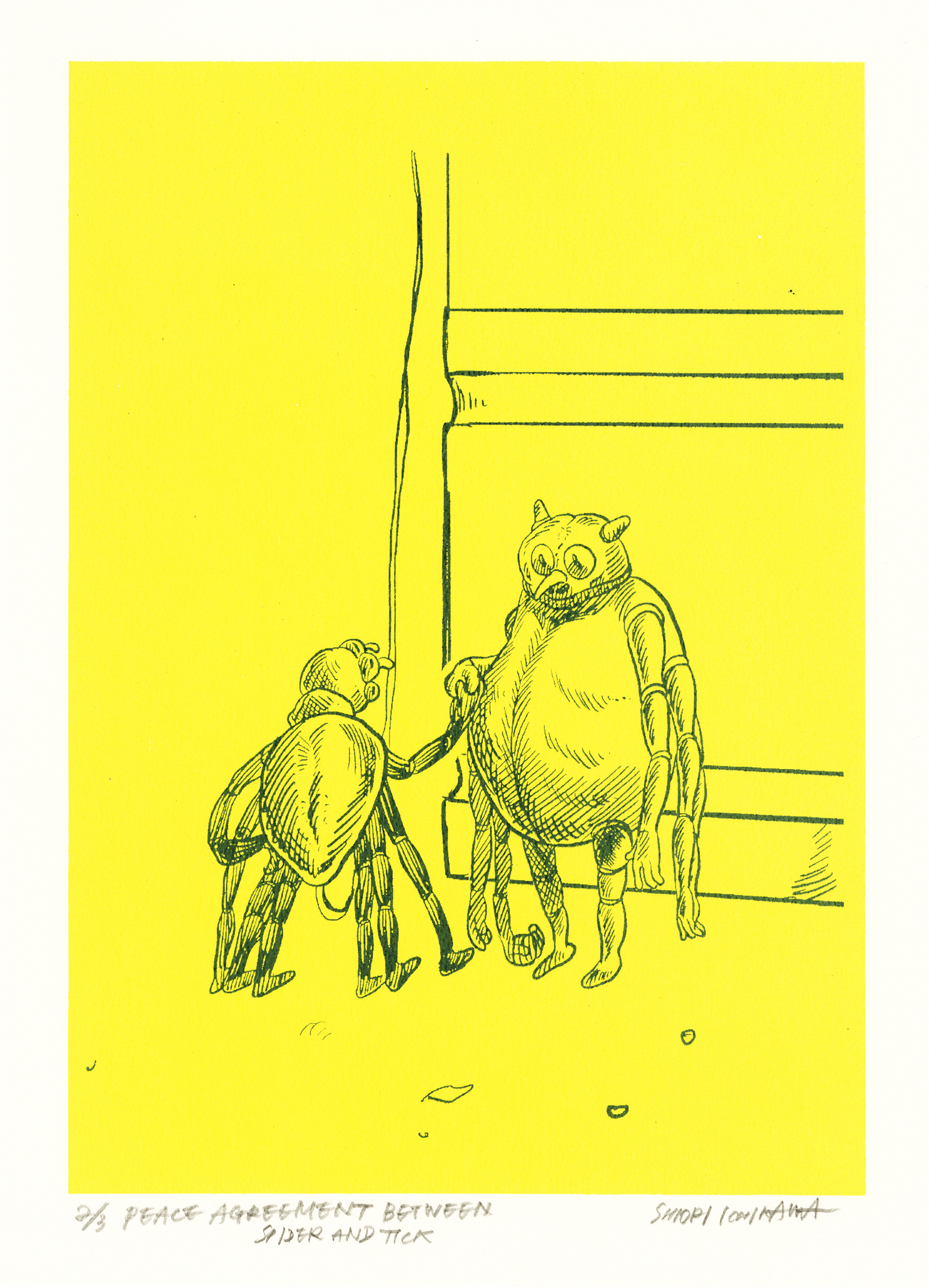 In this work, I depicted a tick and a spider who make an agreement to get along in the human house.