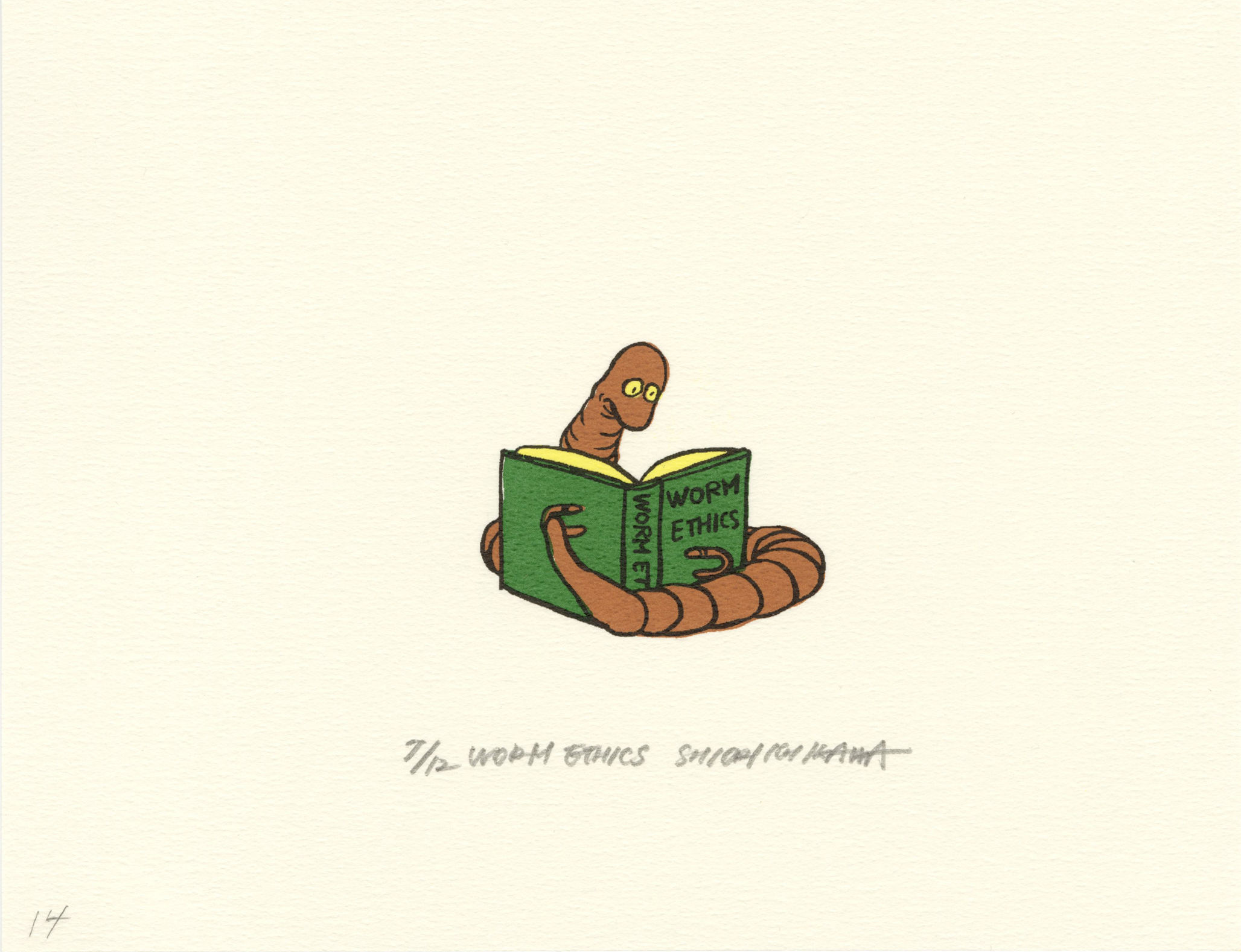 A worm flips through a book with a look of wanting to say something. The judgment of right and wrong changes with time and culture. What kind of ethics is common to all living creatures to live well?