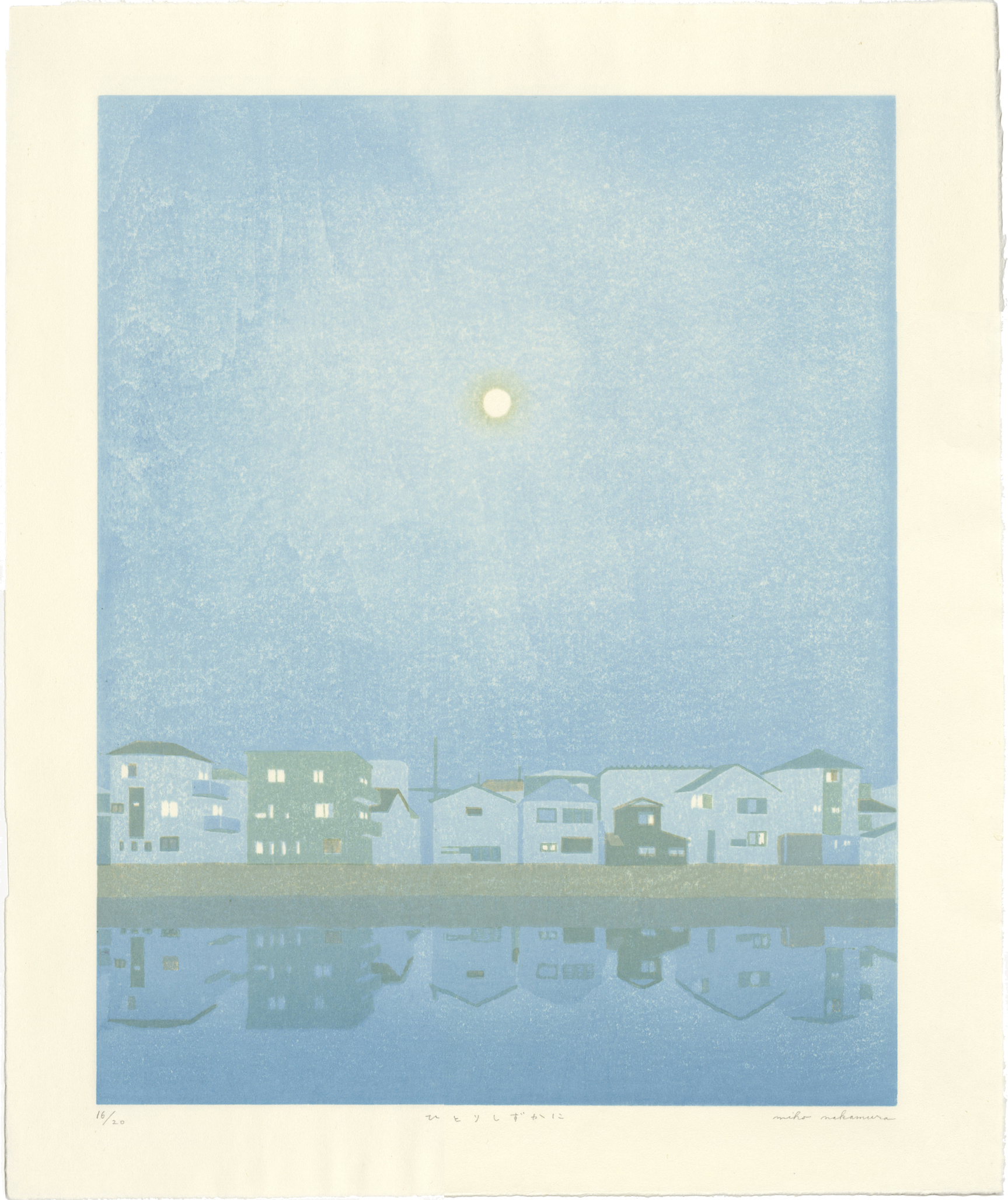 薄暗い空に、優しく浮かぶ月。穏やかな空気に包まれた住宅が波の立たぬ静かな水面に映っている。夕暮れが愛おしくなるような一枚だ。こちらはやや大きな作品で、無垢の木に淡く白色を塗った額付の作品となっている。