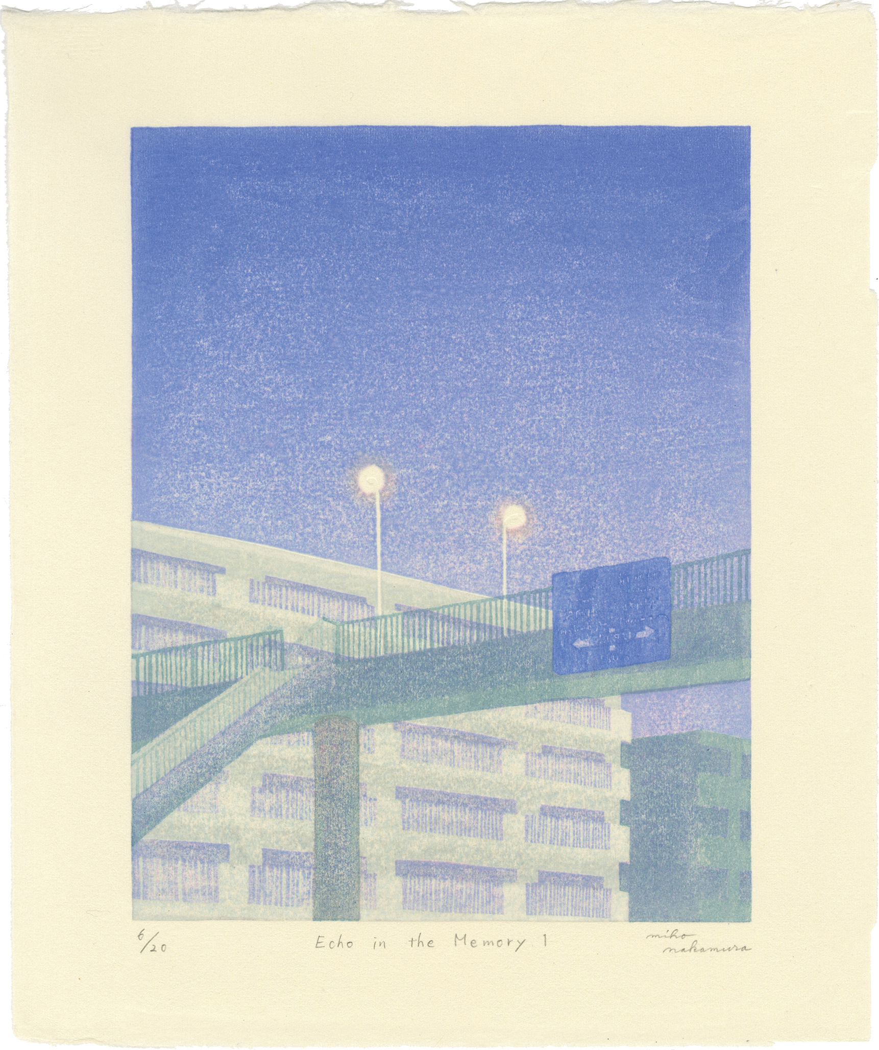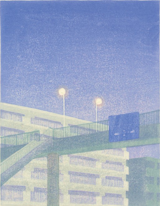 Two gentle lights illuminate the dim sky. In Nakamura's depictions of pedestrian bridges and buildings, people are often not shown, but each piece bears traces of human interaction and invites us on a journey of thought about life, intersecting thoughts, and memories.