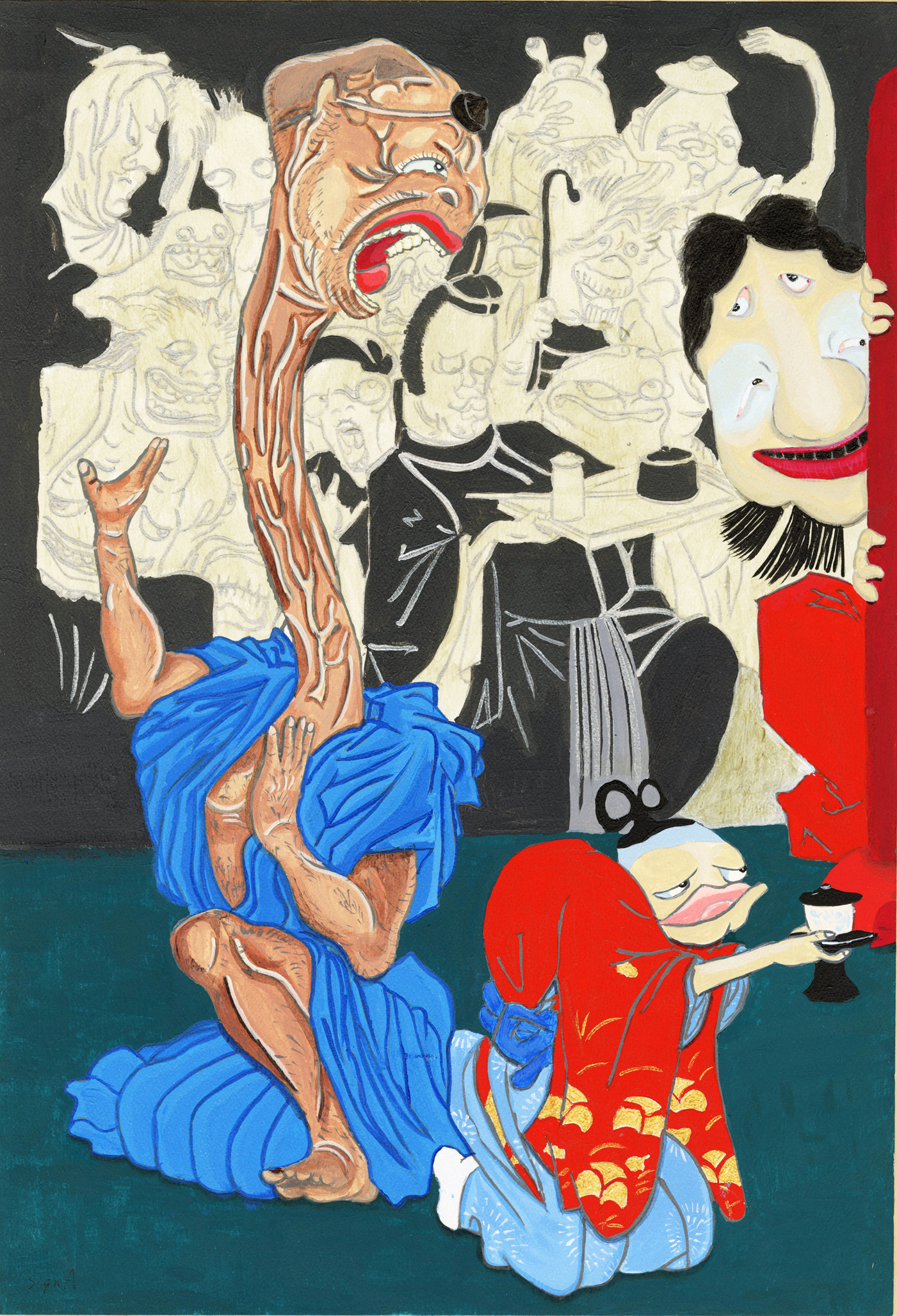 Sign A の作品においても、引用元は明らかで、浮世絵好きであれば一度は目にしたことにあるような有名な図から、人物が切り離され、トリミングされ、改変されて提示されている。