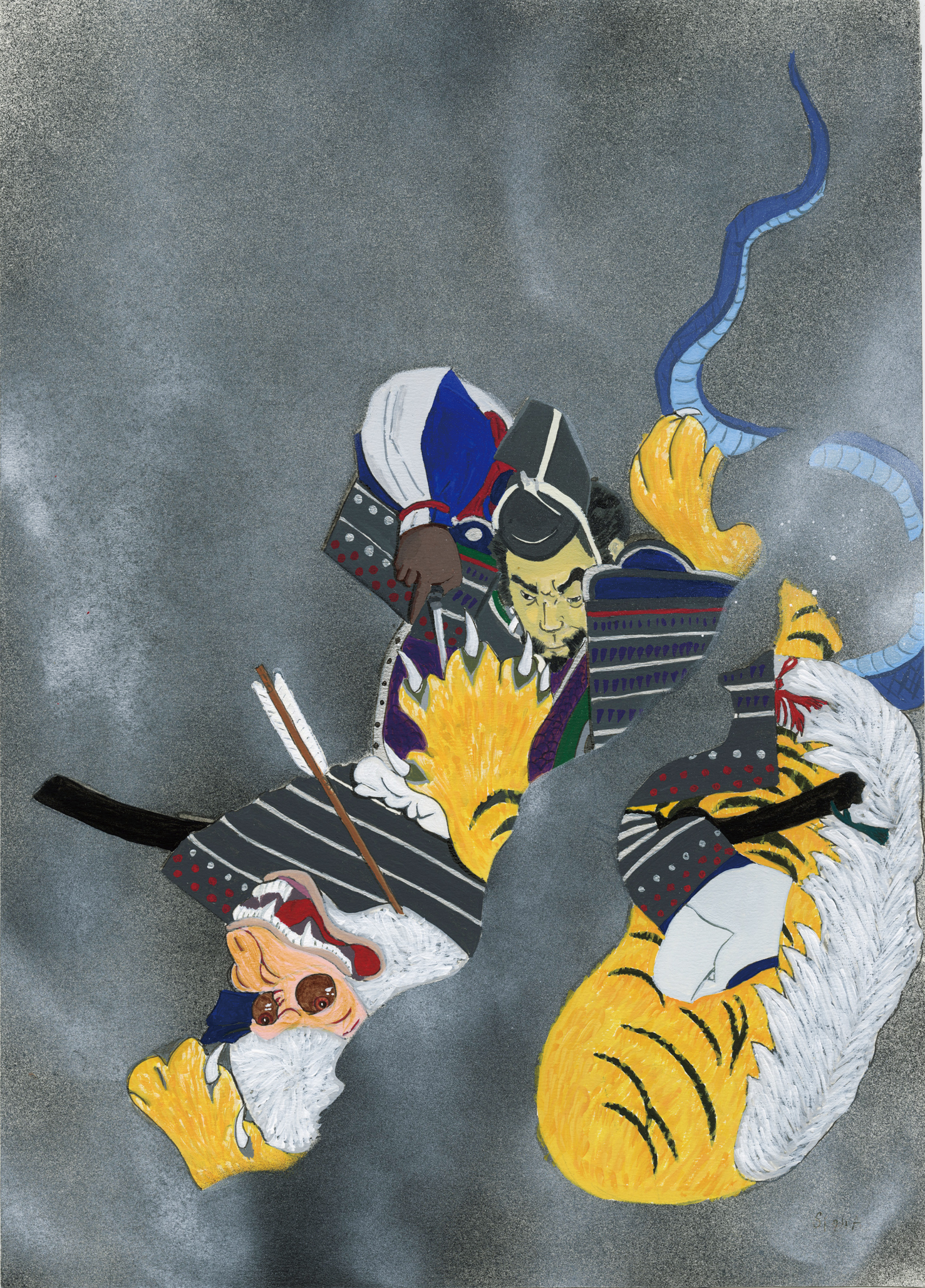 Sign A の作品においても、引用元は明らかで、浮世絵好きであれば一度は目にしたことにあるような有名な図から、人物が切り離され、トリミングされ、改変されて提示されている。