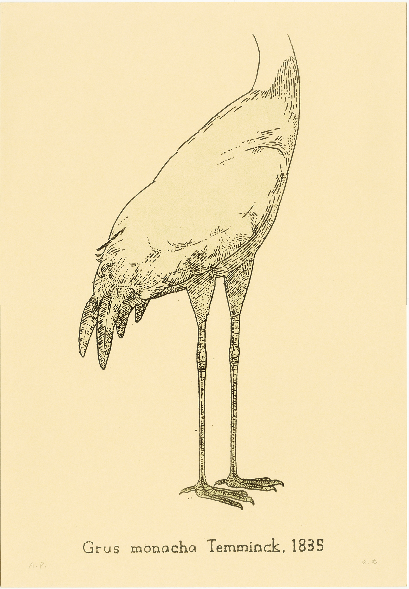 Azusa Takahashi finds the flatness of lithographs interesting. Her final project at Tokyo University of the Arts, a series of birds, was inspired by the memories of the bird-watching trips with her father, in her childhood. For her, the beautiful forms and unique colors of birds are a wonderful existence that cannot be surpassed by anything else. When she captures this existence in her hand, the process of printmaking seems to create a blank space and maintain a good distance between the subject and the artist. Sometimes interspersed with personal episodes, the series is composed like a unique picture book, and is a joy to collect.