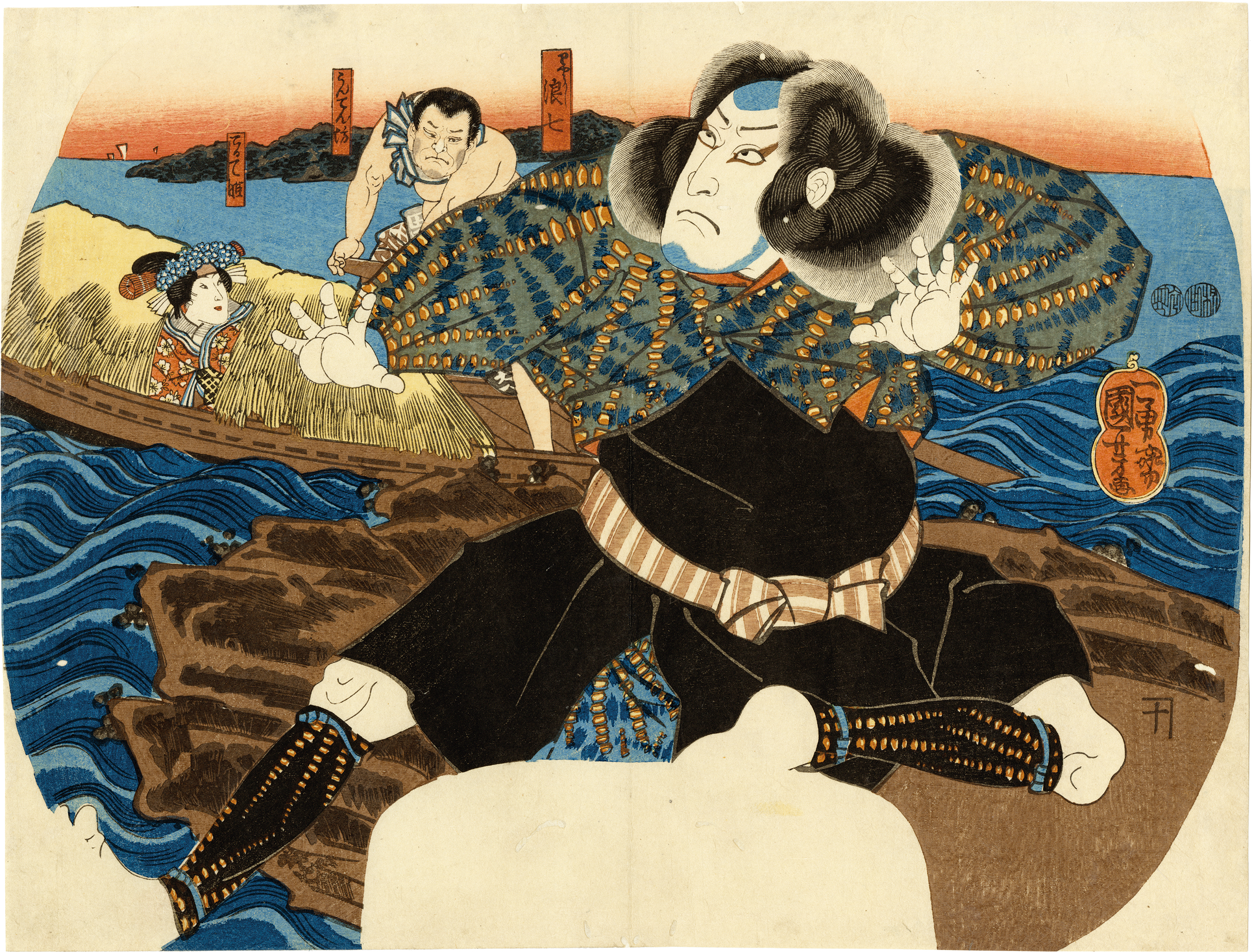 画面中央、勇しく見得を切るのは漁師浪七(りょうしなみしち)。運命に翻弄される小栗判官と照手姫の伝説を描いた歌舞伎演目「當世流小栗判官(とうりゅうおぐりはんがん)」の一場面である。画面奥、舟に載せられているのは小栗判官の許婚である照手姫。浪七は小栗の元家臣であった。小栗と姫の結婚を邪魔するために雇われた胴八に妻を刺され、逃げられそうになった浪七は、そのはらわたを湖に捧げ、命の代わりに舟を押し戻すようにと竜神に願った。すると嵐によって舟は岸に戻り、最後の力を振り絞って胴八を切った浪七は照手姫を逃がし、そこで息絶えるのであった。