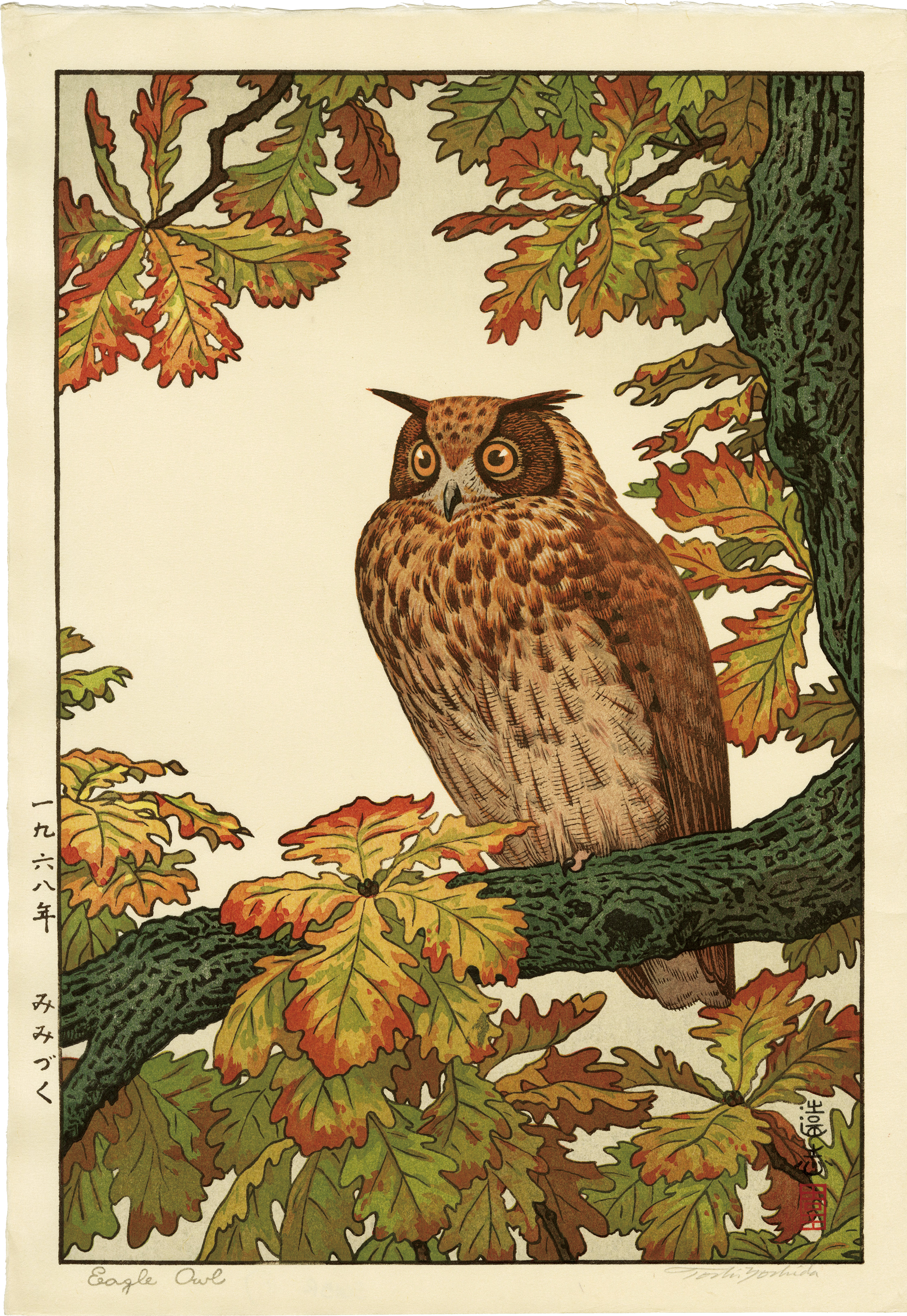 秋の訪れ、美しく色付く葉に縁取られたみみずくが一匹。