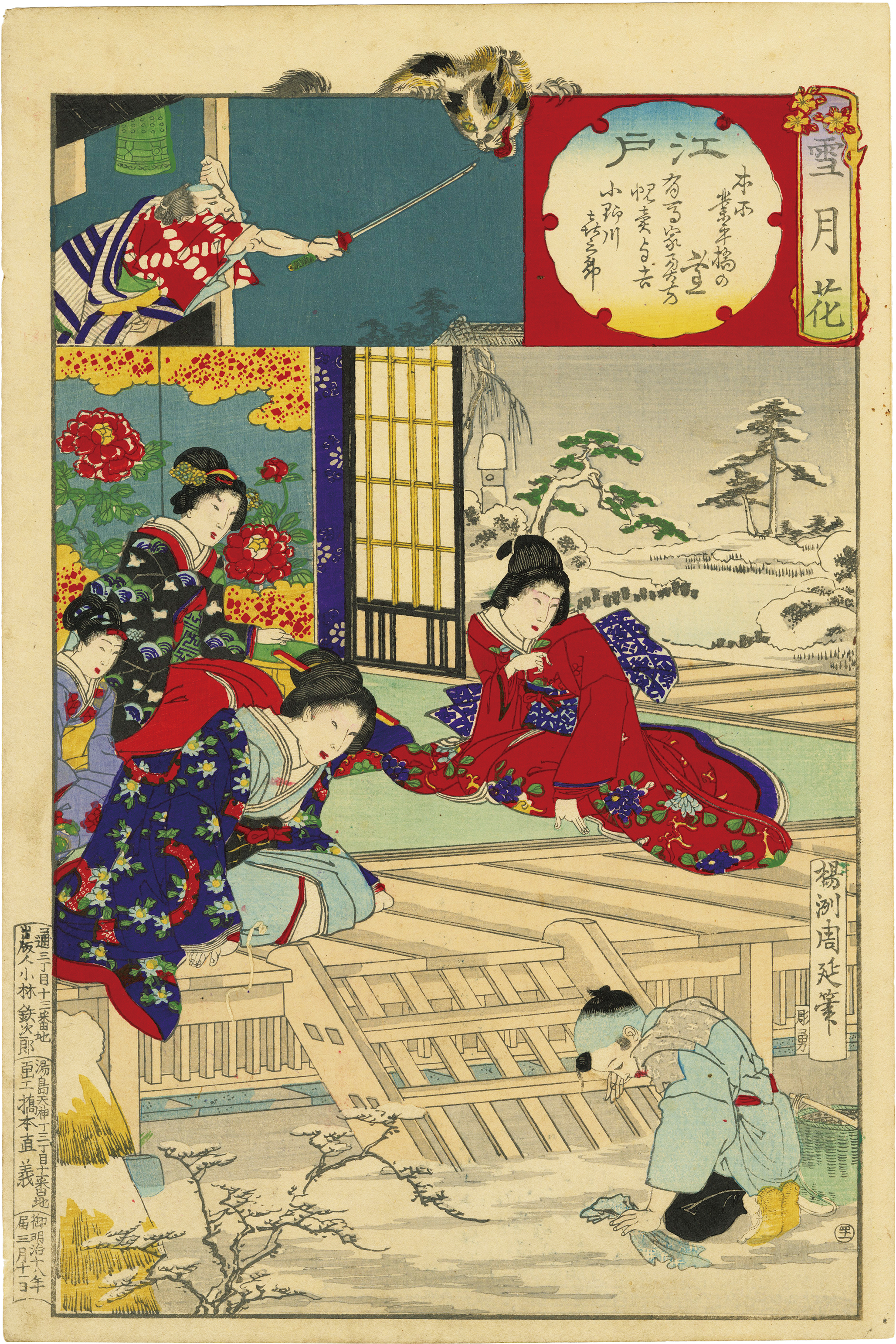 Chikanobu used to use the name YoshitsuruⅡ, however, he became a pupil of ToyokuniⅡafter Kuniyoshi died, and after ToyokuniⅢ died, he became a pupil of Kunichika. Then, finally, his name became Chikanobu.