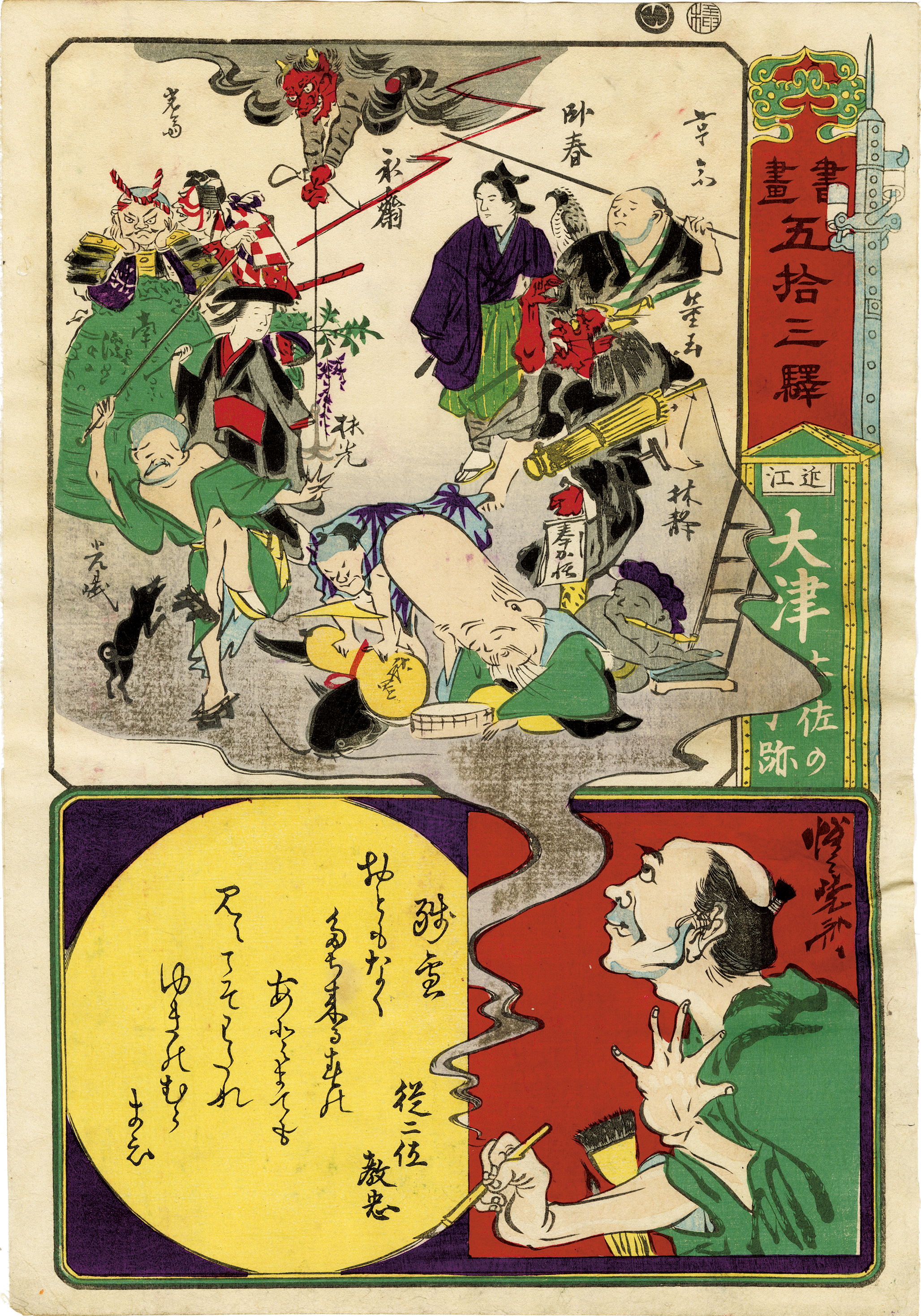 暁斎は天保8年に国芳に入門するも、天保11年には狩野派の絵師前村洞和に再入門。洞和は暁斎の画才を愛し、「画鬼」と呼んだという。安政5年に狩野派を離れて「惺々狂斎」と号し、浮世絵を描き始め戯画・風刺画で人気を博した。他に万延頃から周麿と称して浮世絵を描き始めている。明治14年の第2回内国勧業博覧会に出品した「枯木寒鴉図」が「妙技二等賞牌」を受賞。暁斎はこの作品に百円という破格の値段をつけ、周囲から鴉一匹にその値段は高すぎると非難されると「これは鴉の値段ではなく長年の画技修行の価である」と答えたという。これに心意気を感じた榮太樓本舗店主・細田安兵衛は本当に百円で購入して、周囲を驚かせた。